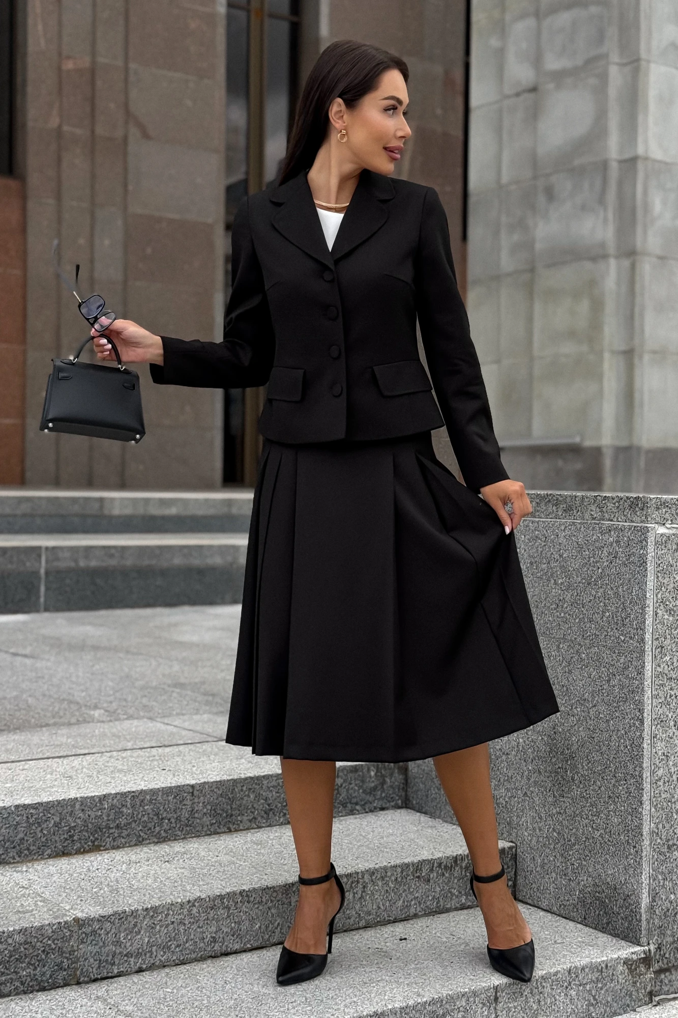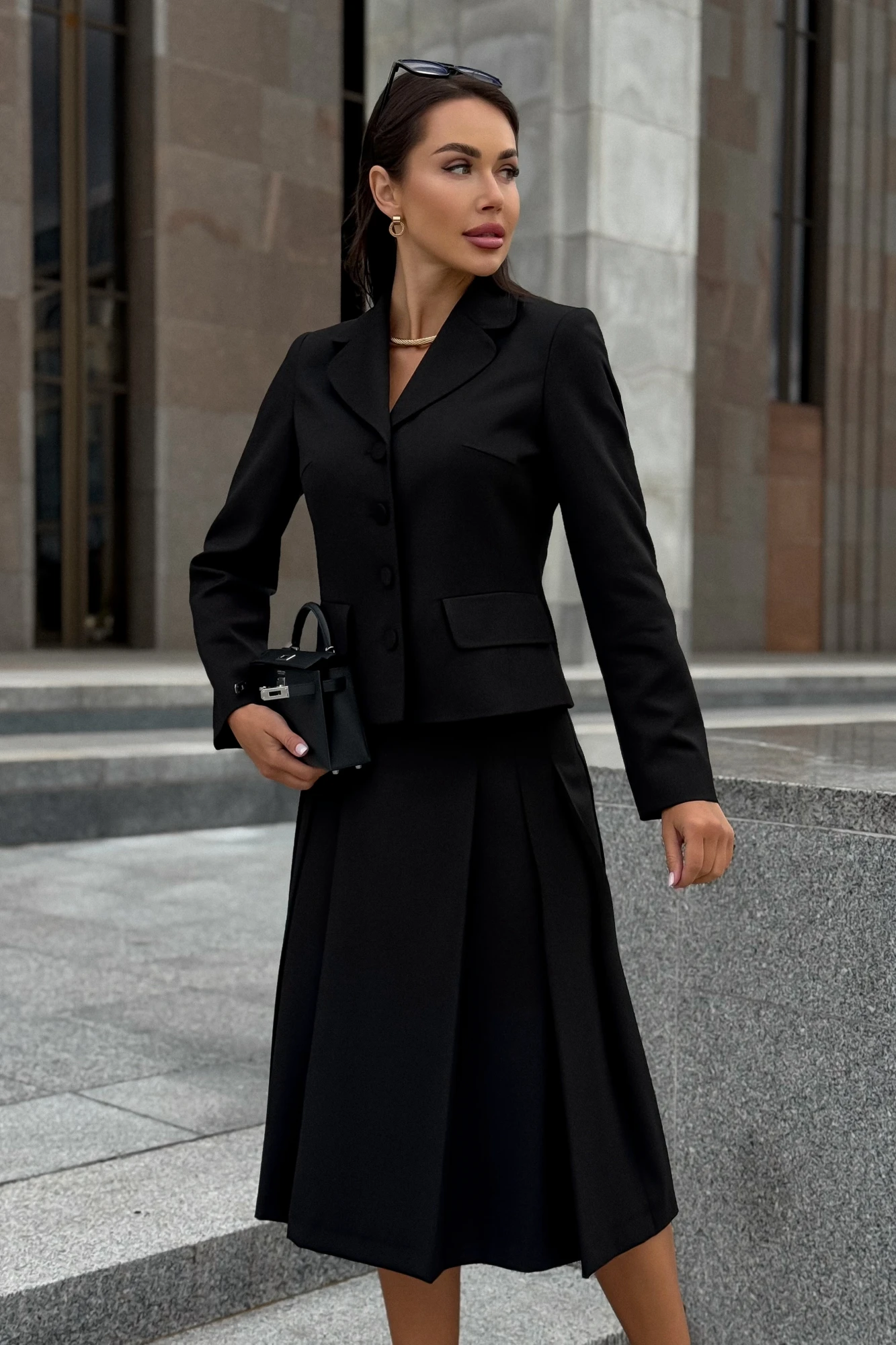 Жакет Длина по среднему шву спинки – 53,5 см (±2,0 см), Ширина на уровне глубины проймы - 53,5 см (±1,0 см), Ширина на уровне линии талии - 48,5 см (±1,0 см), Ширина на уровне линии низа - 56,0 см (±1,0 см), Длина рукава - 61,5 см (±1,0 см), Ширина рукава вверху - 19,5 см (±1,0 см), Ширина рукава по низу - 13,0 см (±0,5 см). Длина плеча - 11,8 см (±0,5 см). Юбка Длина по среднему шву заднего полотнища с поясом – 70,0 см (±2,0 см), Ширина на уровне линии талии - 40,0 см (±1,0 см), Ширина на уровне линии бедер - 54,0 см (±1,0 см). Ширина пояса - 3,0 см (±0,5 см),