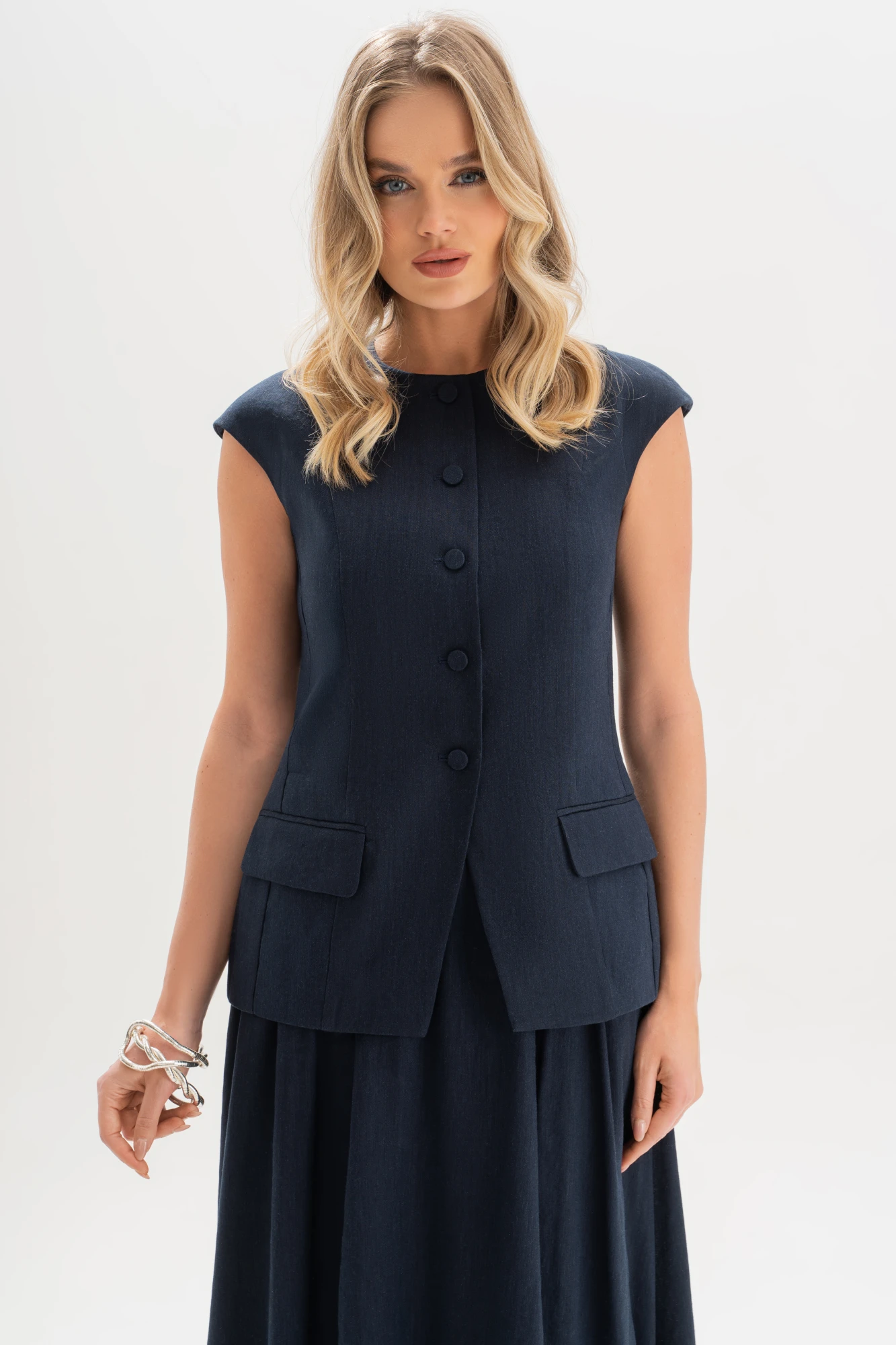 Жилет Длина по среднему шву спинки - 62,0 см (±2,0 см), Ширина на уровне глубины проймы - 48,0 см (±1,0 см), Ширина на уровне линии талии - 44,0 см (±1,0 см), Ширина на уровне линии бедер - 56,5 см (±1,0 см), Длина плеча ( удлиненного) - 17,5 см (±0,5 см). Юбка Длина юбки по боковому шву с поясом- 93,0 см (±2,0 см), высота пояса - 3,0 см. Ширина на уровне линии талии - 39,0 см (±1,0 см), Ширина по низу - 124,0 см (±1,0 см).