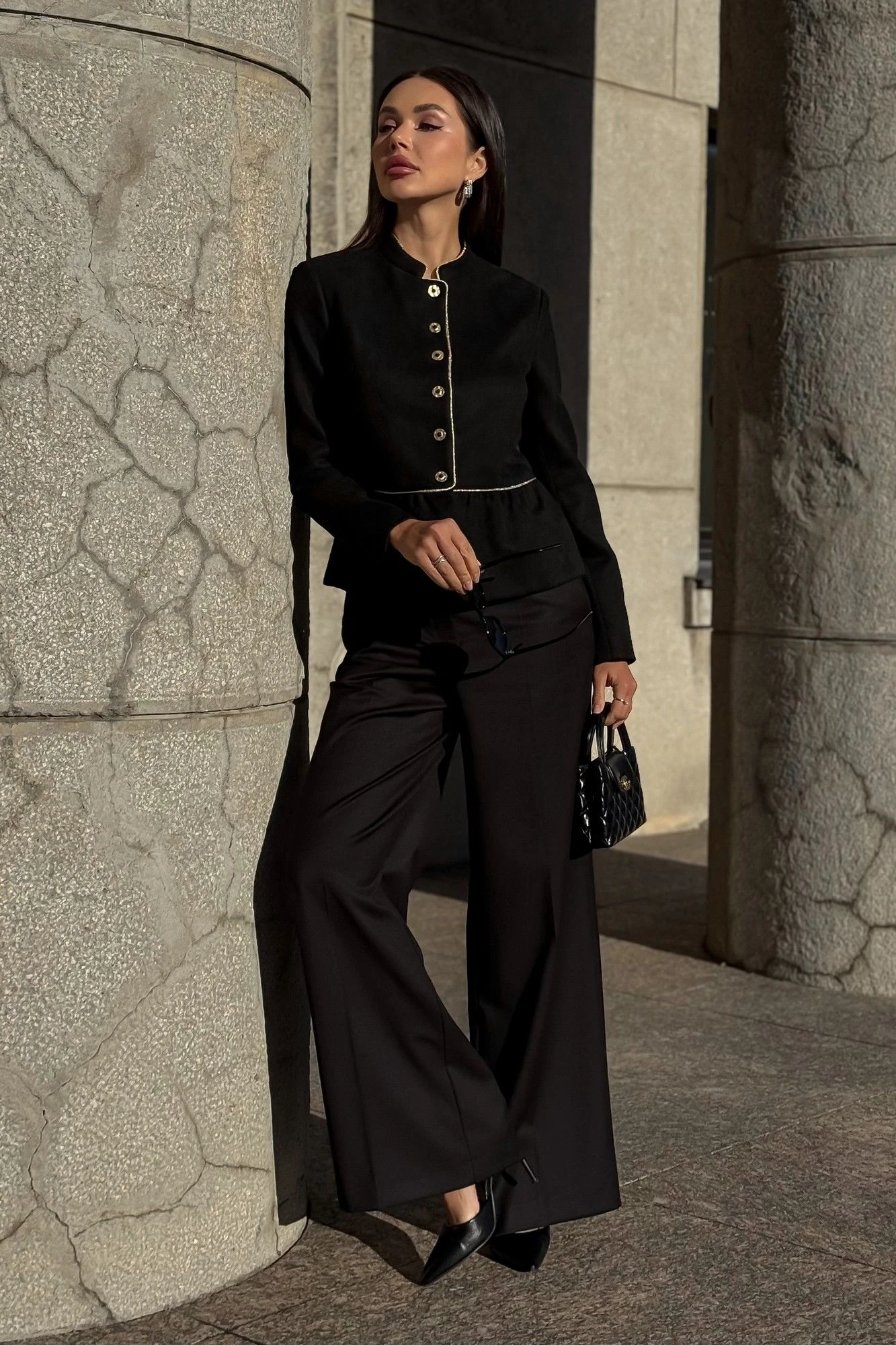 Жакет Длина по среднему шву спинки – 53,5 см (±2,0 см), Ширина на уровне глубины проймы - 53,5 см (±1,0 см), Ширина на уровне линии талии - 48,5 см (±1,0 см), Ширина на уровне линии низа - 56,0 см (±1,0 см), Длина рукава - 61,5 см (±1,0 см), Ширина рукава вверху - 19,5 см (±1,0 см), Ширина рукава по низу - 13,0 см (±0,5 см). Длина плеча - 11,8 см (±0,5 см). Юбка Длина по среднему шву заднего полотнища с поясом – 70,0 см (±2,0 см), Ширина на уровне линии талии - 40,0 см (±1,0 см), Ширина на уровне линии бедер - 54,0 см (±1,0 см). Ширина пояса - 3,0 см (±0,5 см),