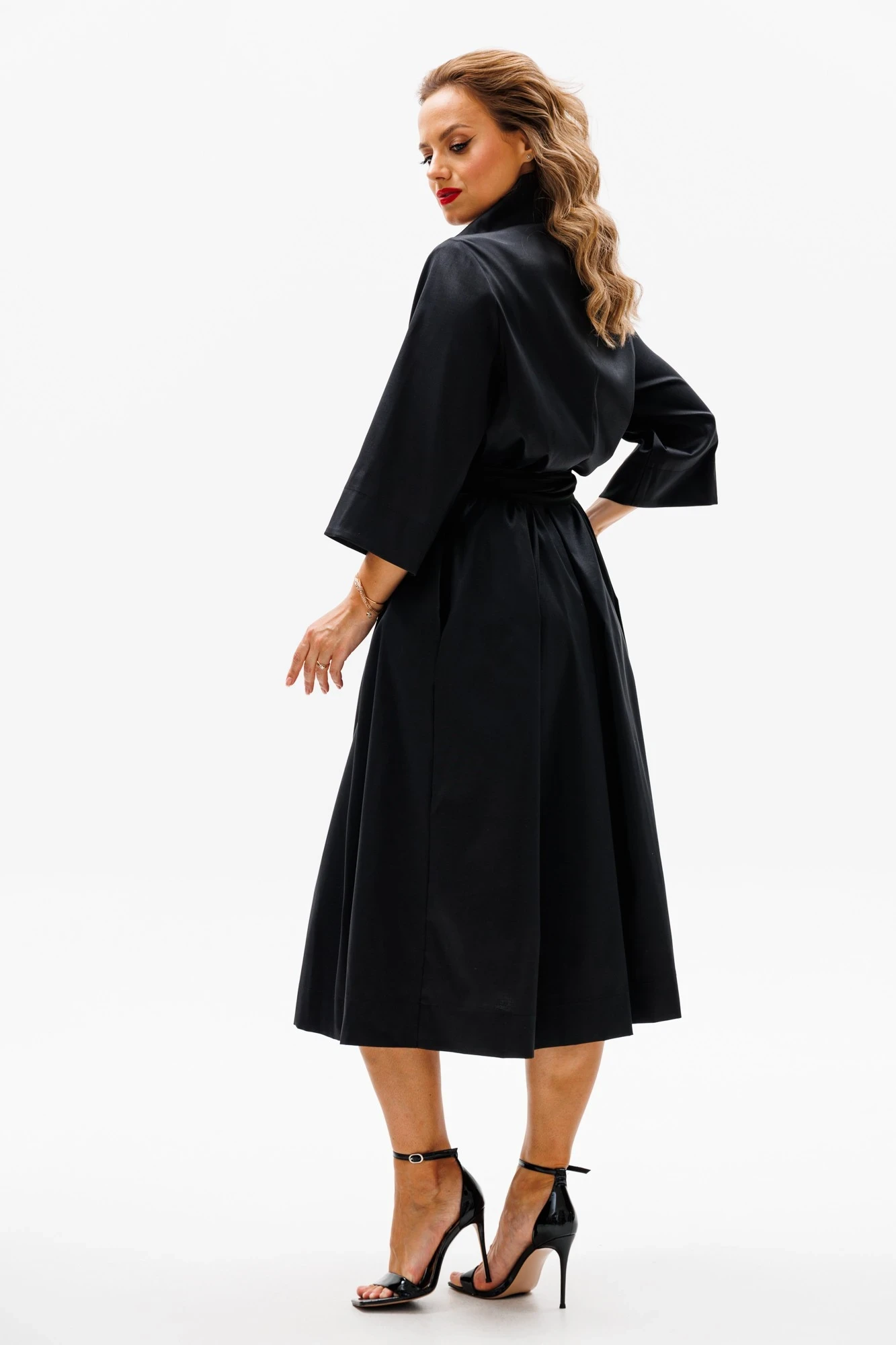 Элегантное женское платье из текстильной ткани. Отрезное по линии талии. По полочке объем груди создается за счет направленных складок из подреза. Объем юбки создается за счет центральной встречной и 2-х односторонних складок. По бокам в юбке- карманы. Рукав втачной, 3/4 длинны с отворотом. Вырез горловины лодочка с отложным воротником. В качестве декора- по воротнику стразы, и съмный пояс с декоративными нашивками.