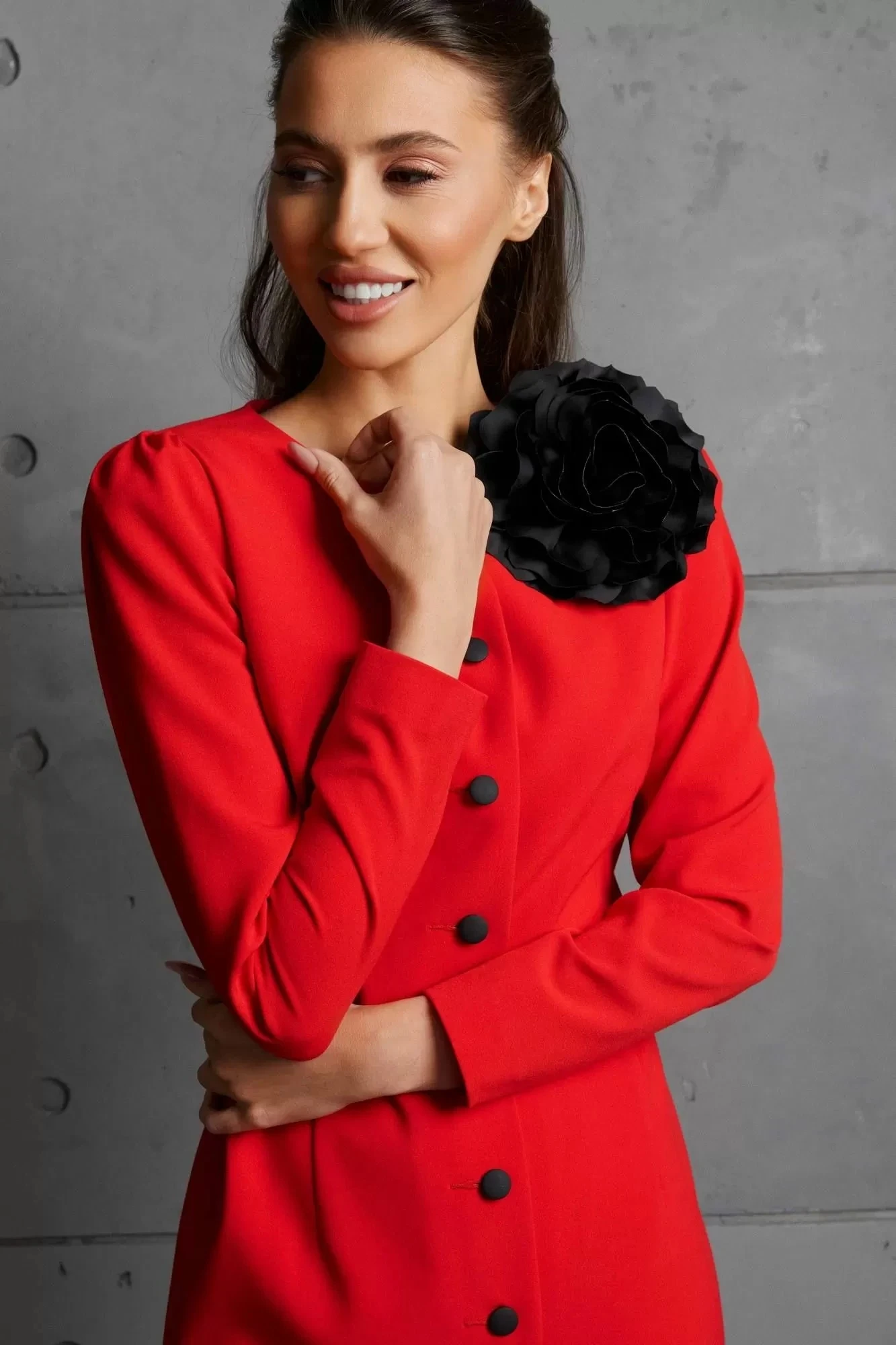 Платье женское из однотонной ткани, прилегающего силуэта, вырез горловины полукруглый, рукав втачной со сборкой по верхней части, застежа спереди на пуговицы, по переду и спинке изделия вытачки, спереди отделочная деталь-декоративный цветок из ткани, съемный, платье на подкладке.