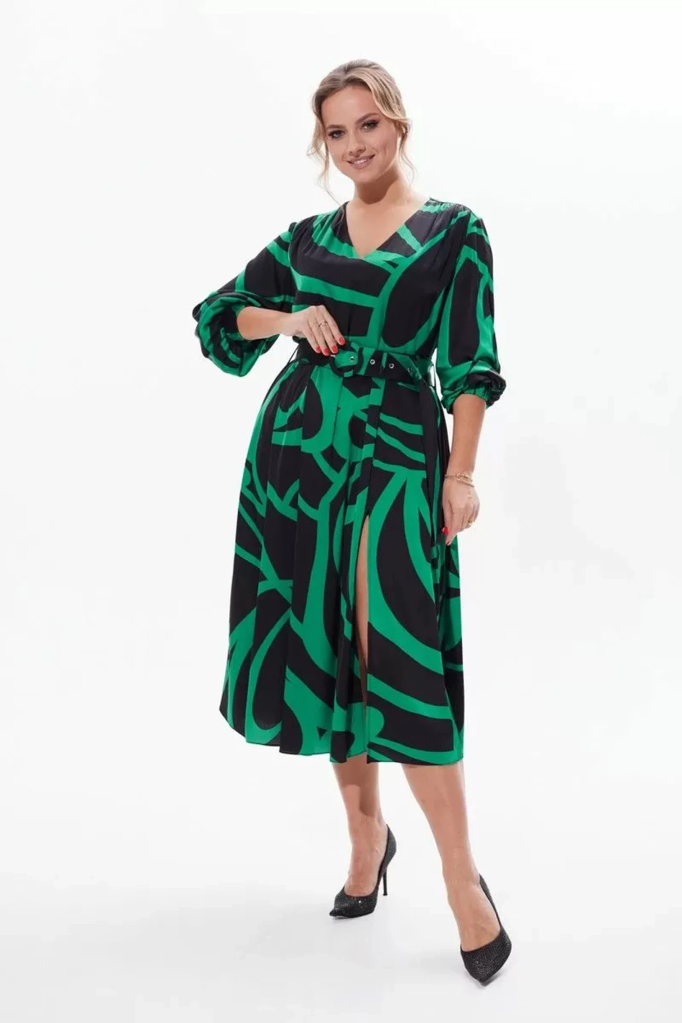 Платье полуприлегающего силуэта длиной миди. V-образная горловина. Юбка платья со складками, есть высокий разрез. Рукав длинный втачной, манжет на резинке. В боковом шве молния. Платье на подкладке. В комплекте идет ремень. Удобное платье и элегантное платье покорит своей легкостью и яркостью!