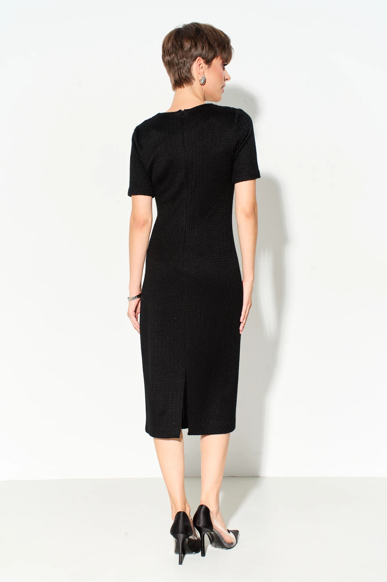 Женское базовое платье со втачными рукавами прилегающего силуэта выполнено из высококачественного трикотажного полотна "в косичку". Вырез горловины круглой формы, по спинке застежка на молнию, внизу шлица. Платье полностью соответствует заявленному размеру. Пожалуйста, пользуйтесть таблицей обмеров готового изделия.