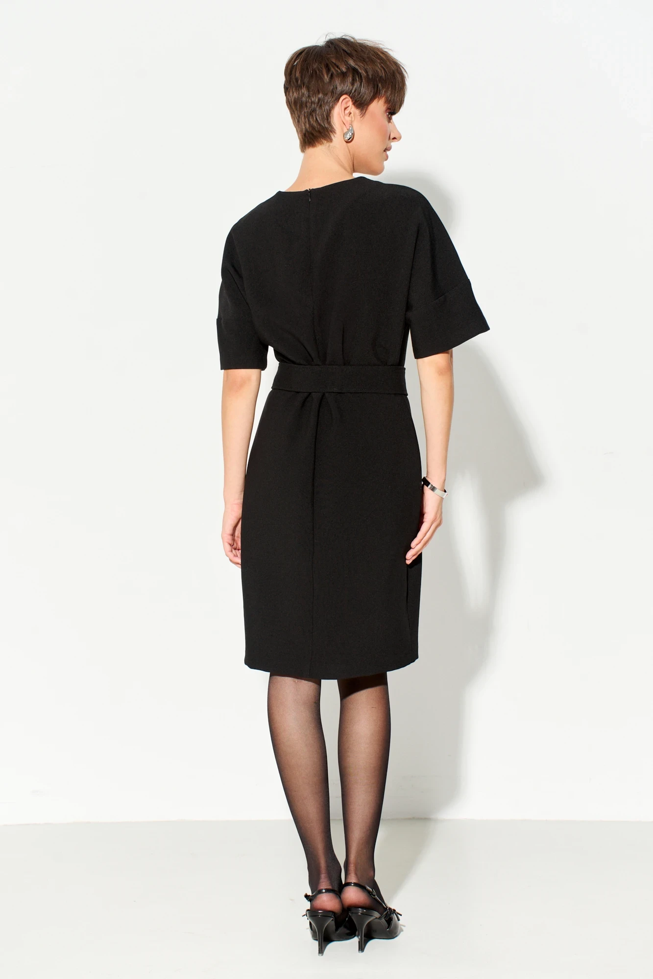 Классическое женское платье полуприлегающего силуэта выполнено из плательной ткани с содержанием вискозы. По переду небольшой декоративный разрез; вырез горловины круглой формы; рукава со спущенной линией плеча; по спинке застёжка на молнию. В комлекте съёмный пояс из основной ткани. Платье полностью соответствует заявленному размеру.