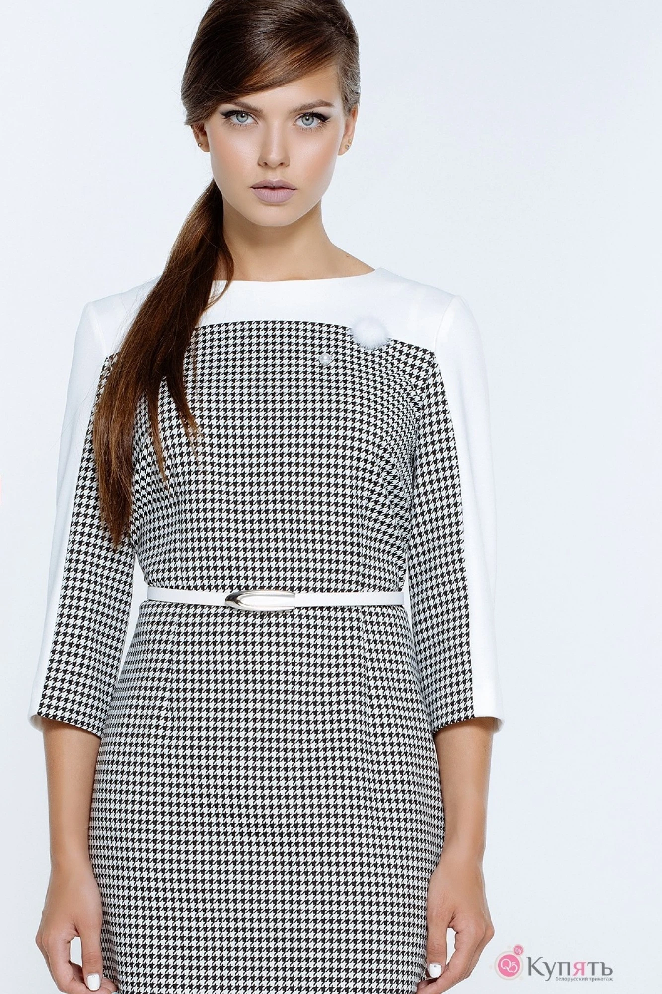 Платье из комбинации двух тканей. Рукав втачной ¾ . На полочке декоративная булавка. Кокетка переда и спинки, часть рукава из отделочной ткани. Спинка со средним швом с застёжкой потайная молния. По талии съёмный пояс.