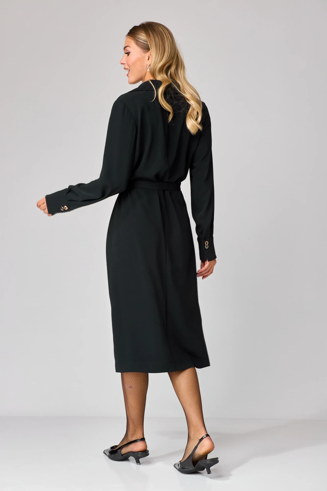 Платье прямого силуэта из плательной ткани. По переду средний шов. Внизу среднего шва разрез. Головина V-образной формы с плосколежачим воротником. Перед с нагрудными вытачками. Рукав втачной одношовный. Низ рукава со складками и на манжете с застежкой на 2 петли и пуговицы. Спинка платья со средним швом. К платью прилагается пояс из основной ткани с застежкой на петлю и пуговицу.