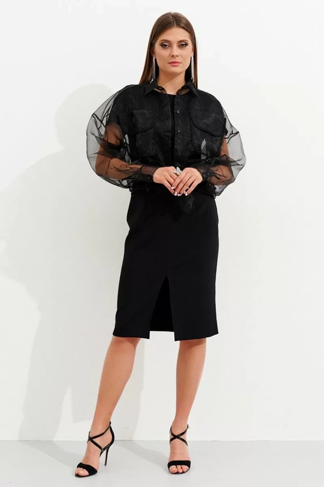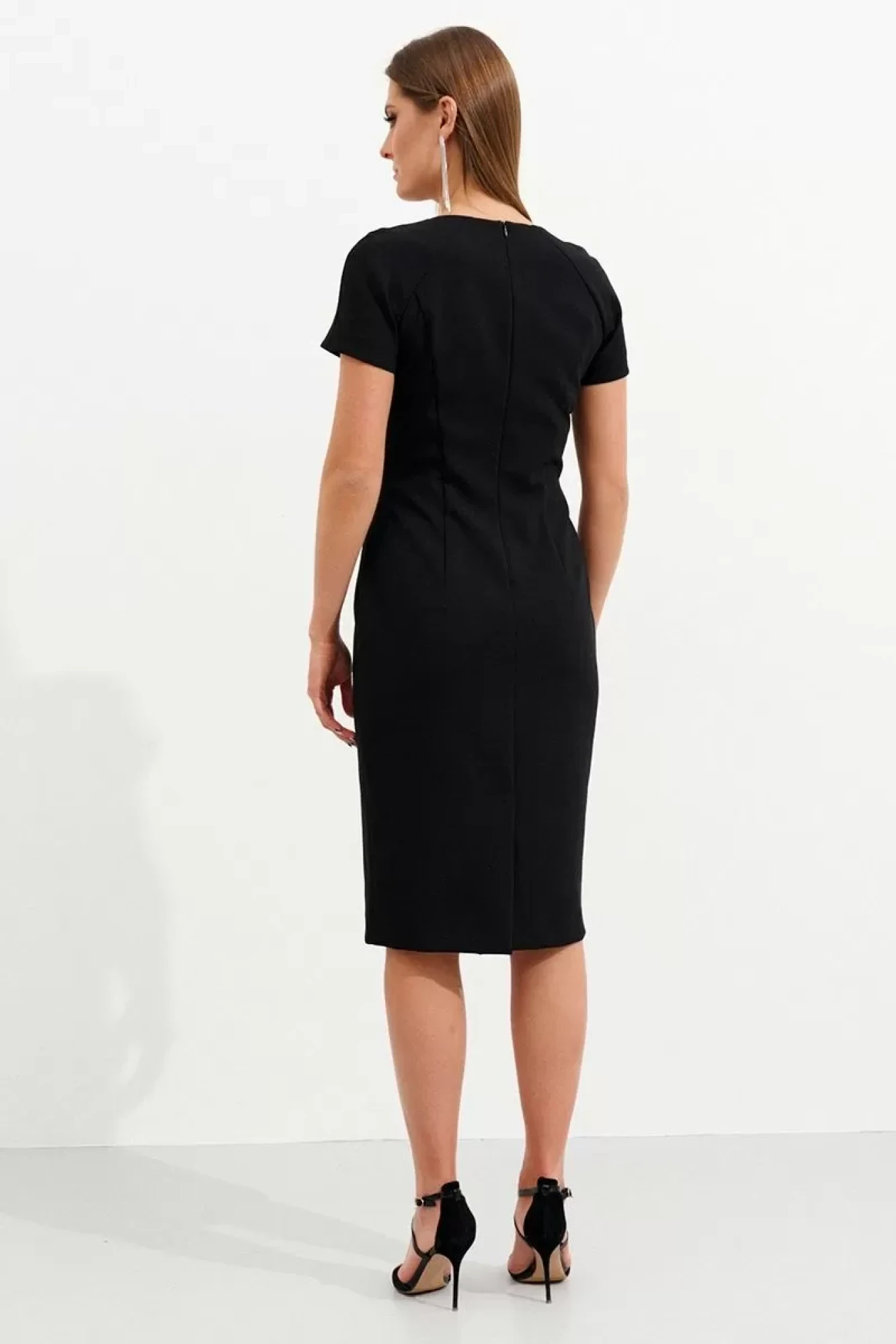 Платье миди с коротким рукавом на потайную молнию сзади, спереди выполнен разрез. Спереди выполнены рельефы.