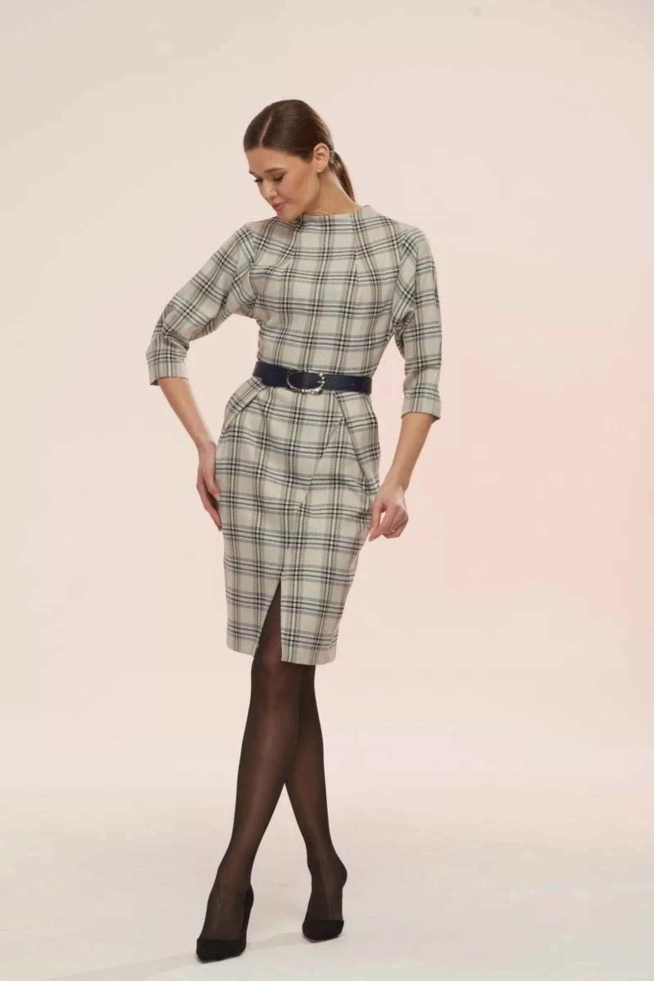 Очаровательное платье премиум-класса! В этом платье Вы будете в центре внимания на любом торжестве. Модный силуэт. Чёткие линии подрезов. Шикарная посадка по фигуре подчёркивает женские формы и прекрасно формирует силуэт, предавая ему столь желанное сходство с песочными часами. Модель с втачным, полурегланным рукавом, длиной ¾ с защипом по нижнему краю. С потайной застёжкой- молнией по среднему шву спинки. Горловина с цельнокроеной стойкой. Обработана обтачкой. По полочке фигурные вытачки к центру груди. Спинка с талевыми вытачками и вытачками по горловине. Перед платья по линии талии со складками , придающими форму песочных часов. По переду нижней части платья рельеф в виде запаха; разрез - длиной 16,5 см. Фигурные боковые карманы. Платье без подкладки. Длина платья от талии – 59,5 см. Декоративный съёмный пояс подчёркивает изящество фигуры.
