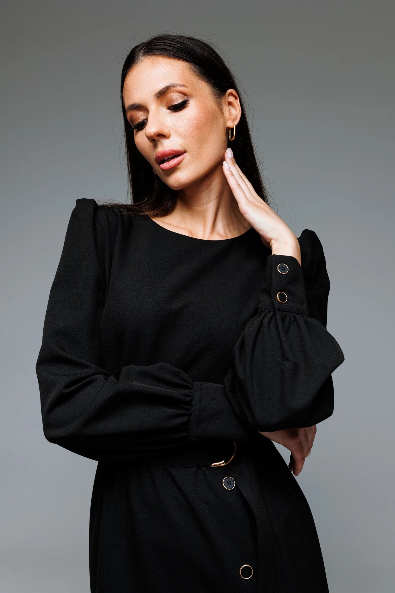 Восхитительное платье на любой случай! Платье отрезное по линии талии. Лиф с нагрудными и талиевыми вытачками. На спинке-талиевые вытачки, которые делают силуэт изящнее. По линии талии, для балансирования размерного объема, в шов вставлена эластичная тесьма (резинка, шириной 1 см). Горловина округлой формы. По окату и низу рукава-сборка. Рукав втачной, одношовный, длиной 64,5 см на манжете, высотой 8 см и застежкой на петли-пуговицы. Нижняя часть платья-прямого силуэта, чуть зауженная к низу. По линии талии также расположены талиевые вытачки. Конструктивная деталь - смещенный разрез с контрастными планками на пуговицах, разрез функциональный. В среднем шве спинки расположена застежка - потайная молния.