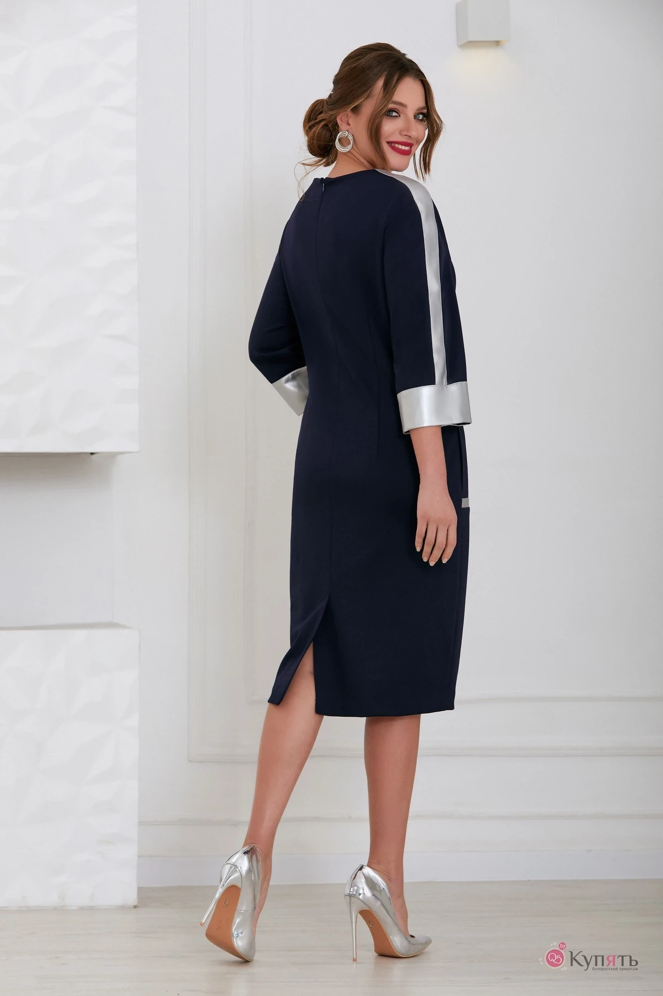Дизайнерское платье в стиле минимализм из трикотажа в сочетании с отделкой из металлизированной эко кожи. Универсальная базовая вещь для создания многообразия луков, подходит для шпилек и обуви на плоском ходу. Платье полуприлегающего силуэта с фигурными карманами, перед оформлен нагрудными вытачками из проймы и украшен декоративной нашивкой. Вырез горловины округлый, от горловины вдоль плечевого шва по рукаву и до манжета широкая вставка из кожи. Спинка со средним швом и талиевыми вытачками, застежка на потайную молнию в среднем шве спинки, по низу шлица . Рукава втачные с притачной широкой манжетой из кожи.