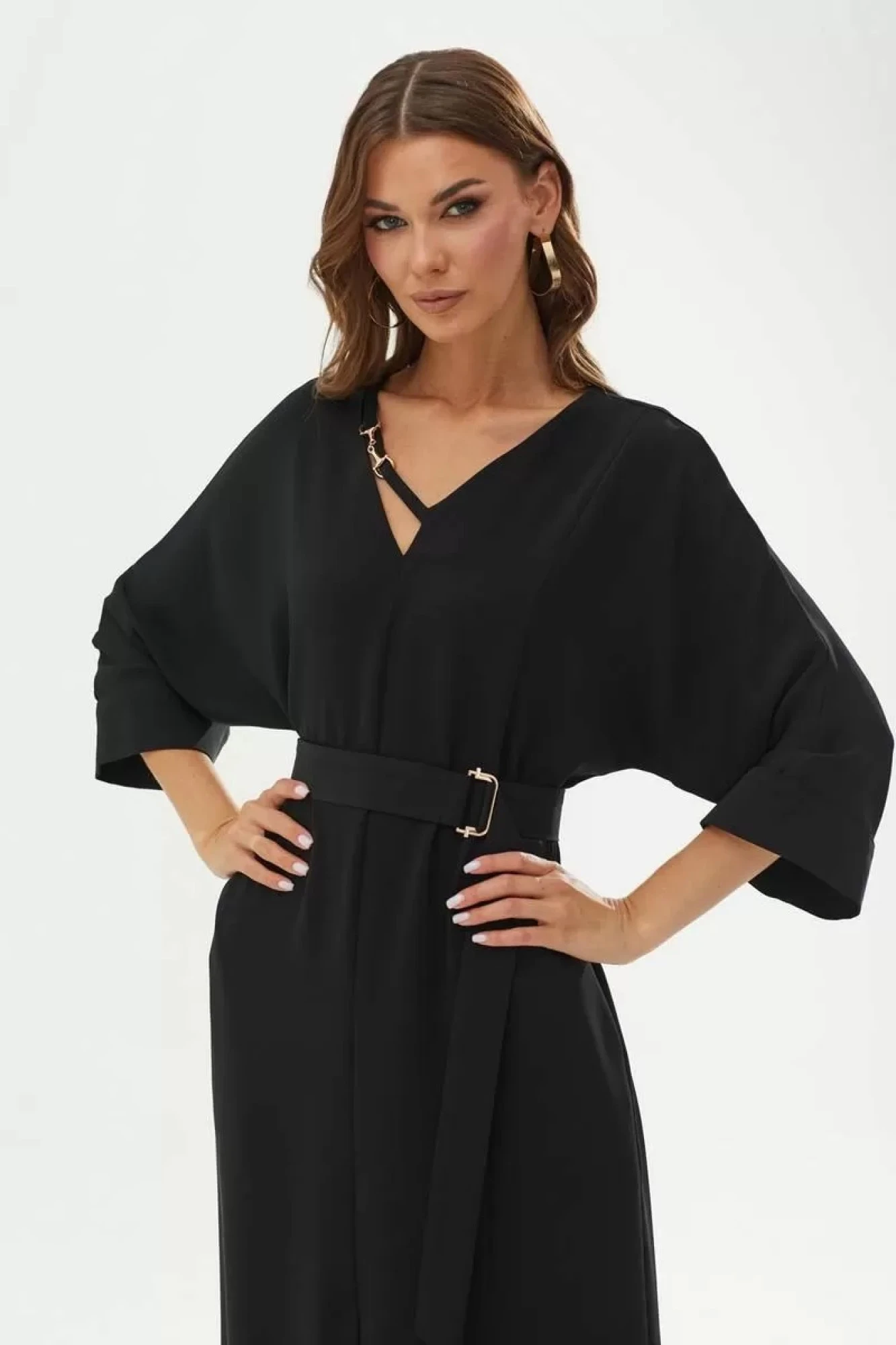 Стильное платье прямого силуэта из струящейся ткани. Горловина V-образная с декоративной деталью. По переду два рельефа, переходящие в шлицы. Рукав цельнокроеный, по низу манжета. В боковых швах карманы. В комплект входит съемный пояс. Обращаем ваше внимание, что фурнитура может незначительно отличаться от фото.