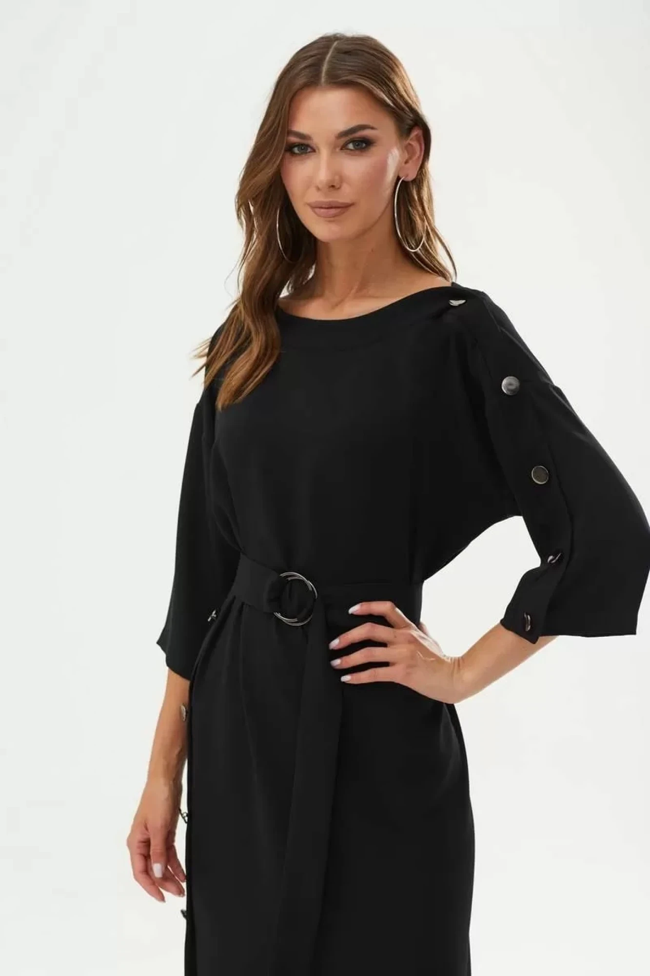 Стильное платье прямого силуэта из струящейся ткани. Горловина округлая. Рукав со спущенной линией плеча. По левому рукаву и вдоль правого бокового шва декоративная планка с пуговицами. По низу платья разрез. В комплект входит съемный пояс. Обращаем ваше внимание, что фурнитура может незначительно отличаться от фото