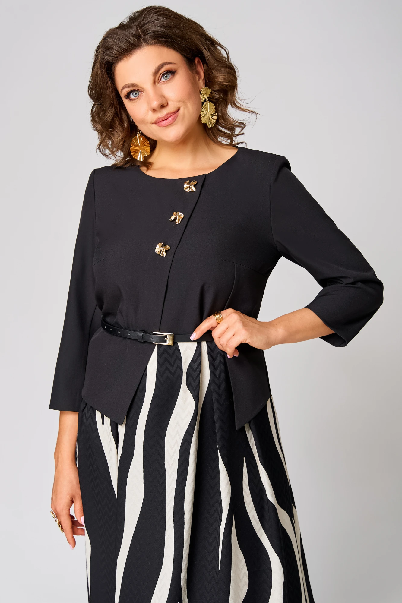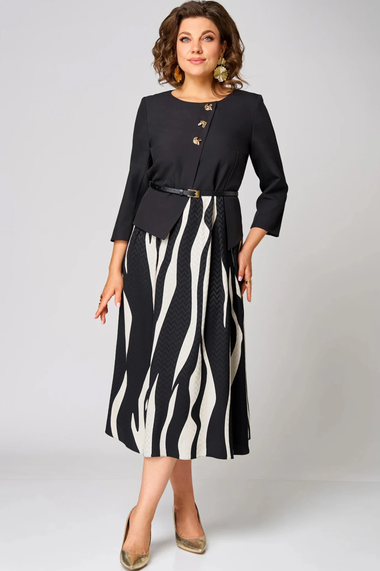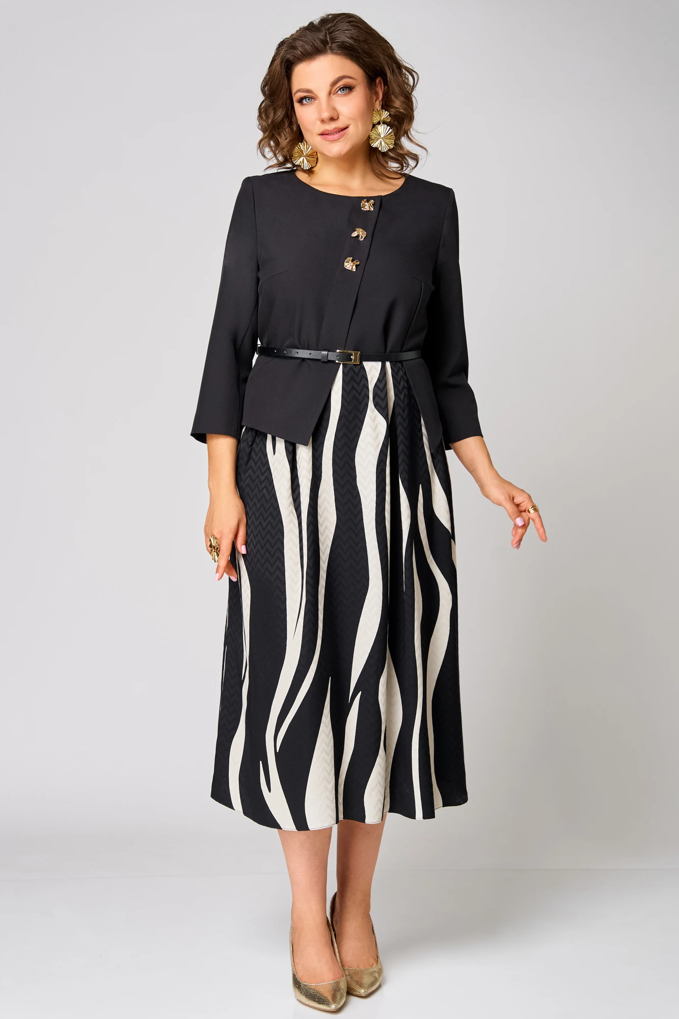 Платье женское А-силуэта из двух разных фактур тканей, отрезное по линии талии, без подкладки. Округлый вырез горловины. Верх платья выполнен из костюмной ткани. По переду застрочены нагрудные вытачки. По правой части переда ассиметричная складка на 3 пуговицы и петли. По левой части переда от нагрудной вытачки имеется отлетная деталь. Сина со средним швом и застежкой на потайную тесьму-молнию. Рукав втачной двухшовный , длина 49см. Юбка в платье выполнена из вискозы. По переднему и заднему полотнищу застрочены встречный складки. Длина платья 120см. Имеется съемный пояс с пряжкой.