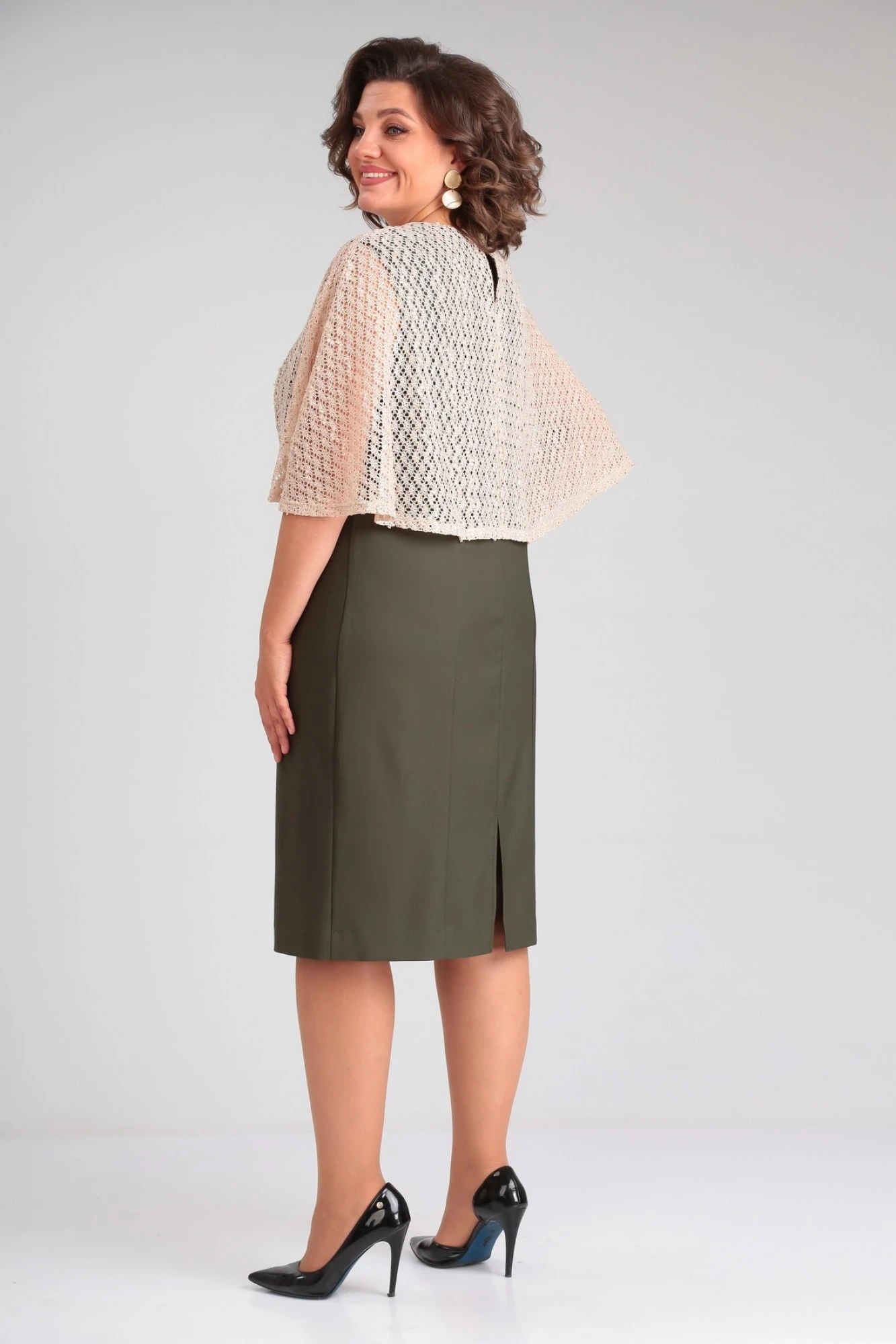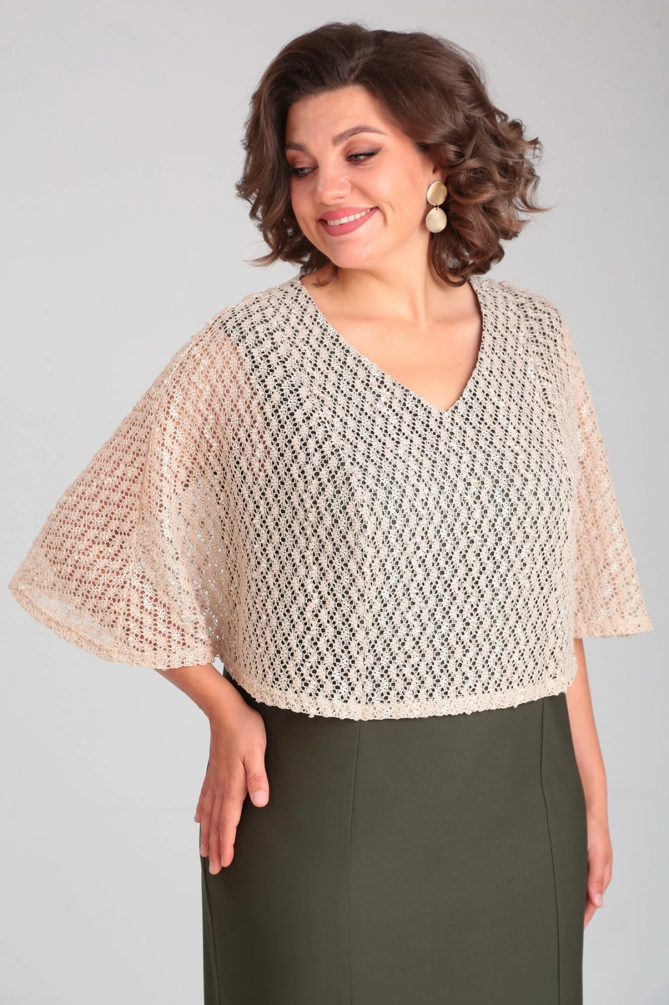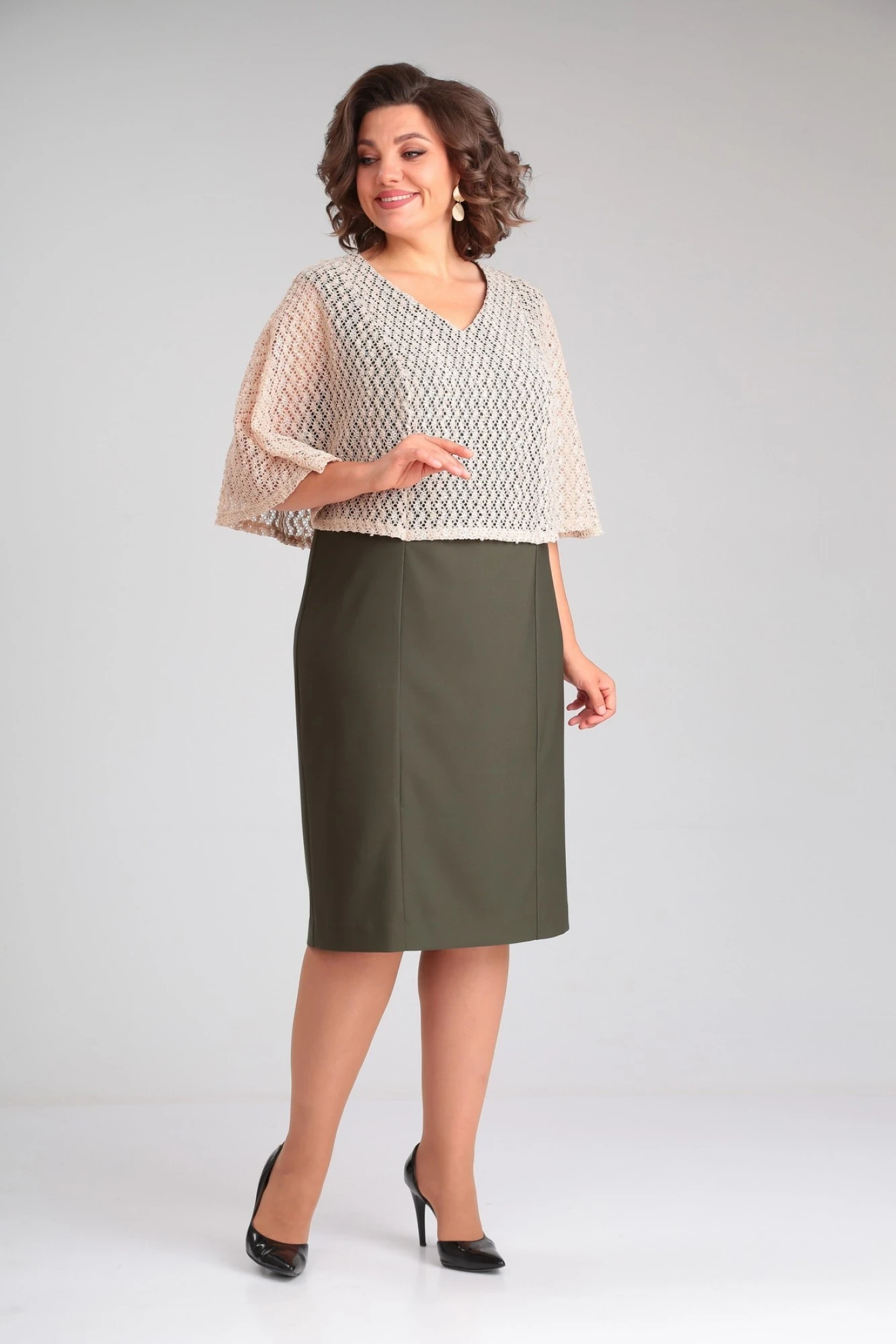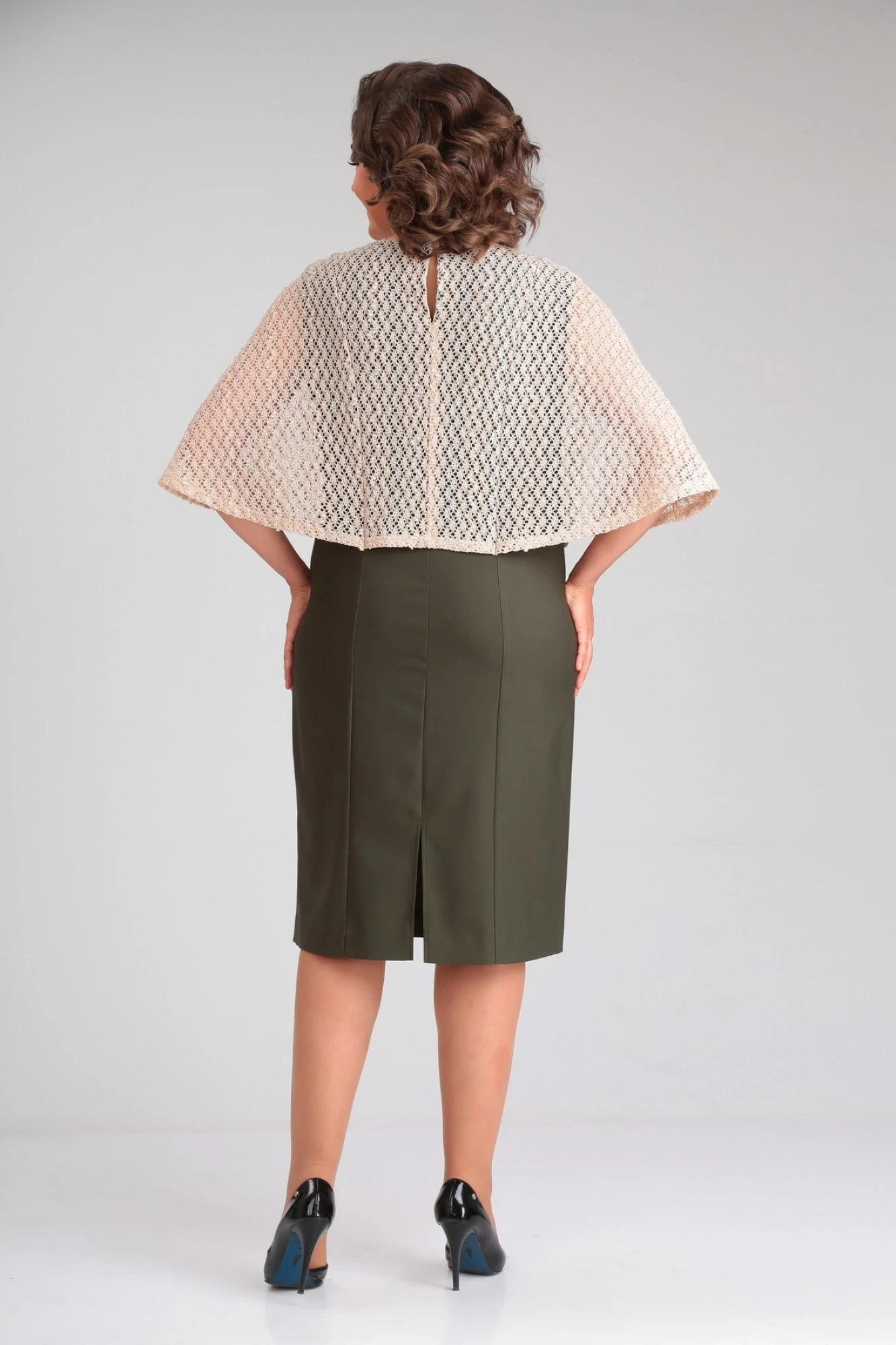 Нарядное женское платье, выполненное из двух видов ткани: верхняя часть - из тонкого трикотажного полотна -гипюр (тянется), нижнее платье – из плательной ткани (тянется). Нижнее платье полуприлегающего силуэта с рельефными швами, без подкладки. В среднем шве спинки застежка на навесную петлю и пуговку, снизу разрез. Верхняя часть платья «Летучая мышь» соединена с нижним платьем по рельефным швам и горловине. Горловина оформлена V-образным вырезом.