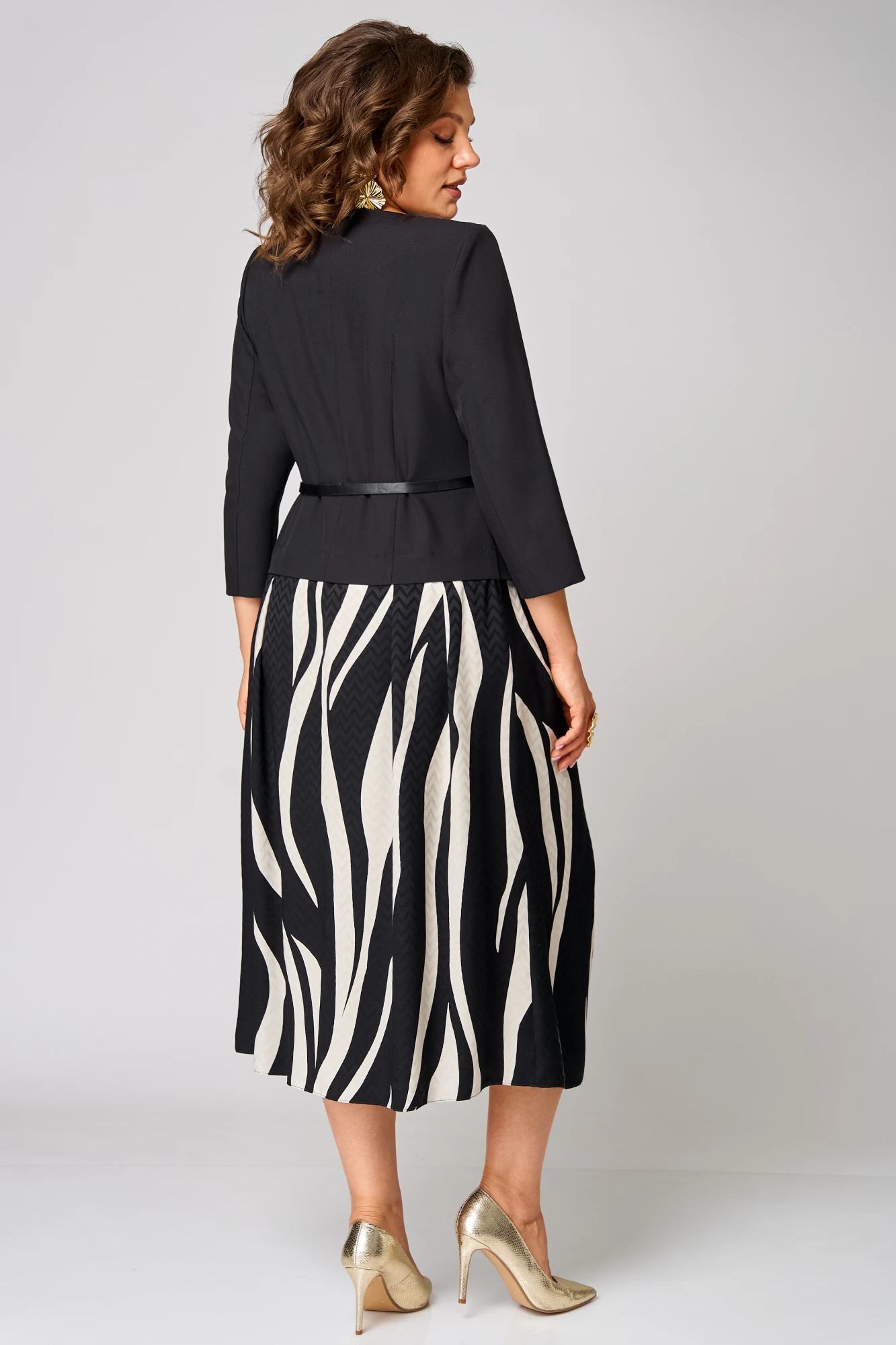 Платье женское А-силуэта из двух разных фактур тканей, отрезное по линии талии, без подкладки. Округлый вырез горловины. Верх платья выполнен из костюмной ткани. По переду застрочены нагрудные вытачки. По правой части переда ассиметричная складка на 3 пуговицы и петли. По левой части переда от нагрудной вытачки имеется отлетная деталь. Сина со средним швом и застежкой на потайную тесьму-молнию. Рукав втачной двухшовный , длина 49см. Юбка в платье выполнена из вискозы. По переднему и заднему полотнищу застрочены встречный складки. Длина платья 120см. Имеется съемный пояс с пряжкой.