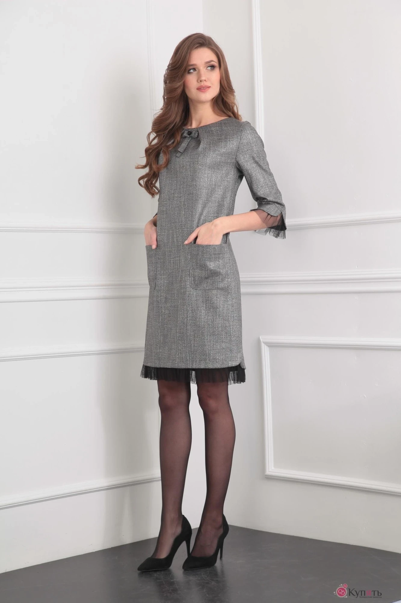 Элегантное женское платье прямого силуэта из костюмно-плательной ткани. Рукав втачной 3/4 с фигурным низом и отделкой из сетки. По переду складки по горловине и декоративное украшение - бант, а также симметричные накладные карманы. По спинке застежка по горловине на петлю-пуговицу. Низ изделия также фигурный с разрезами по бокам и отделкой из сетки.