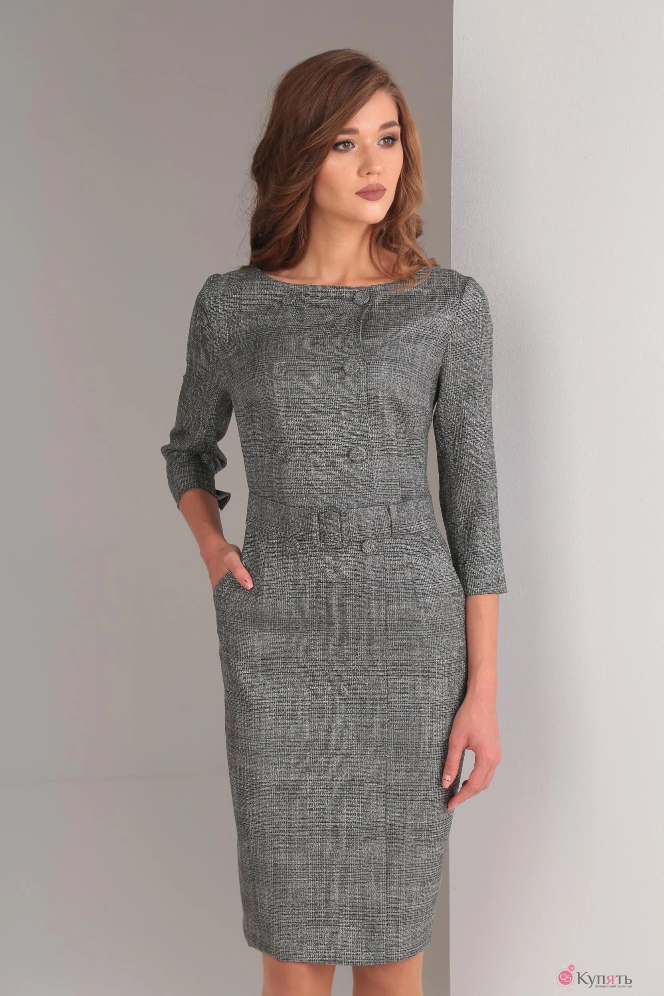Платье женское из костюмно-плательной ткани с металлизированной нитью; полуприлегающего силуэта; отрезное по линии талии. По переду: двубортная застёжка на прорезные петли и пуговицы; нагрудные вытачки(из бокового шва) и талиевые, отрезной вертикальный бочок; горловина – «лодочка», обработанная обтачкой. Низ переда с вертикальным швом, заканчивающимся шлицей. В области бокового шва - карман с бочком. По спинке средний шов с застёжкой на потайную тесьму-молнию. Рукав втачной, двушовный; в локтевом шве по низу неболоьшой разрез; длина 3/4. В комплект входит съёмный пояс, обтянутой пряжкой из основной ткани. Классический крой и модные линии делают эту модель обязательной составляющей вашего гардероба!