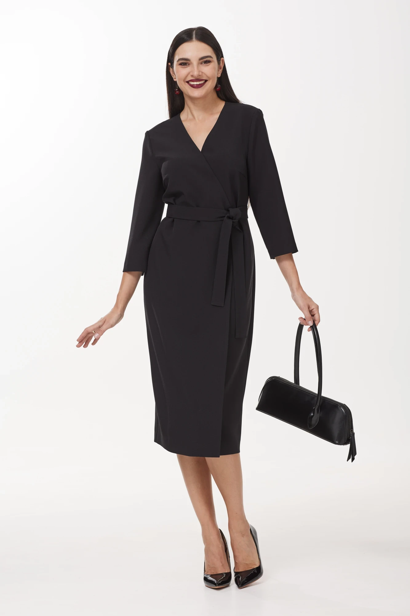 Платье полуприлегающего силуэта, выполненное из плательно-костюмной ткани, длиной миди. Перед с имитацией "платья на запах". По переду обработаны нагрудные вытачки, отлетные детали переда зафиксированы изнутри. Спинка с талиевыми вытачками и со средним швом, в который вставлена потайная молния. Рукав втачной, длиной 3/4. Горловина платья с V-образным вырезом. В комплект к платью идёт съёмный пояс из основной ткани.