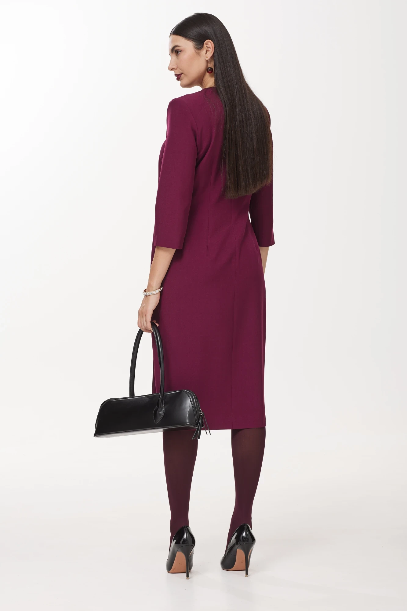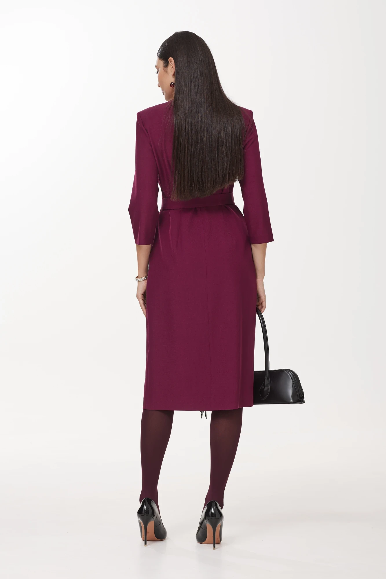 Платье полуприлегающего силуэта, выполненное из плательно-костюмной ткани, длиной миди. Перед с имитацией "платья на запах". По переду обработаны нагрудные вытачки, отлетные детали переда зафиксированы изнутри. Спинка с талиевыми вытачками и со средним швом, в который вставлена потайная молния. Рукав втачной, длиной 3/4. Горловина платья с V-образным вырезом. В комплект к платью идёт съёмный пояс из основной ткани.