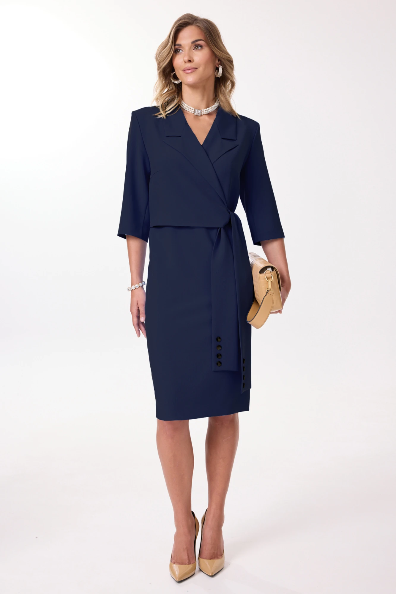 "Платье полуприлегающего силуэта, выполненное из плательно-костюмной ткани, длиной миди. Одна из деталей лифа - отлетная, имитирующая образ комплекта ""жакет и платье"". Перед платья с нагрудными вытачками. Верхняя, жакетная часть платья завязывается на фигурный пояс, декорированный пуговицами. Спинка со средним швом и талиевыми вытачками. В нижней части среднего шва спинки обработана шлица. В левом боковом шве расположена потайная молния. Рукав втачной, двухшовный. Горловина платья оформлена воротником жакетного типа.