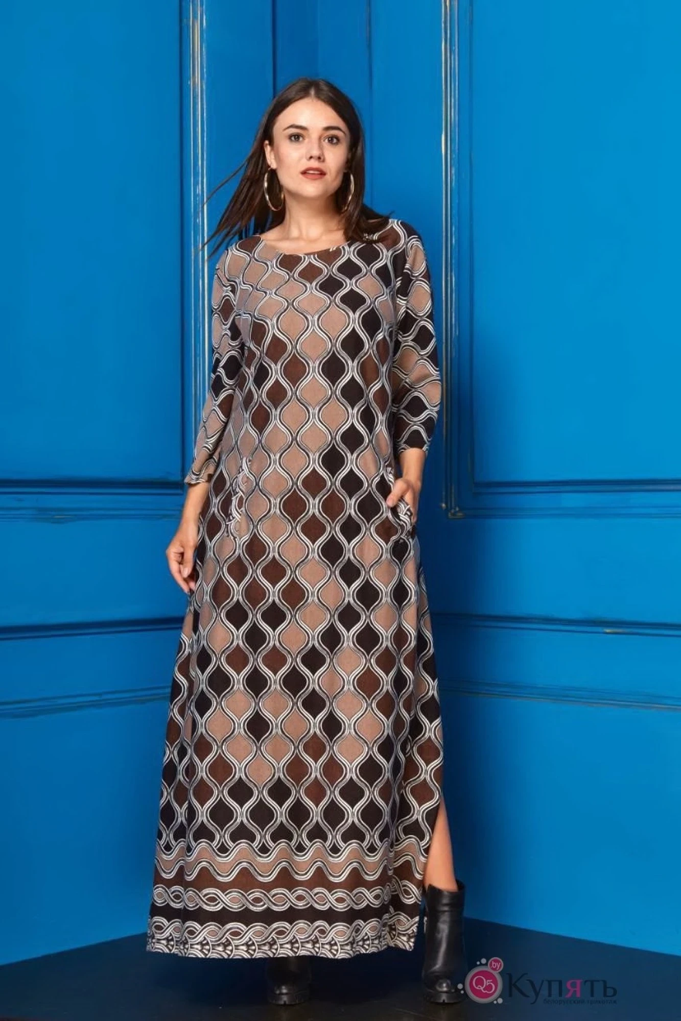 Платье женское из плотного трикотажного полотна с геометрическим рисунком, расширенного силуэта к низу, длинное. По переду нагрудные вытачки с бокового шва. Спинка со средним швом. По боковым швам длинные разрезы. Горловина овальной формы, на обтачке. Рукав одношовный, втачной, длиной 3/4.
