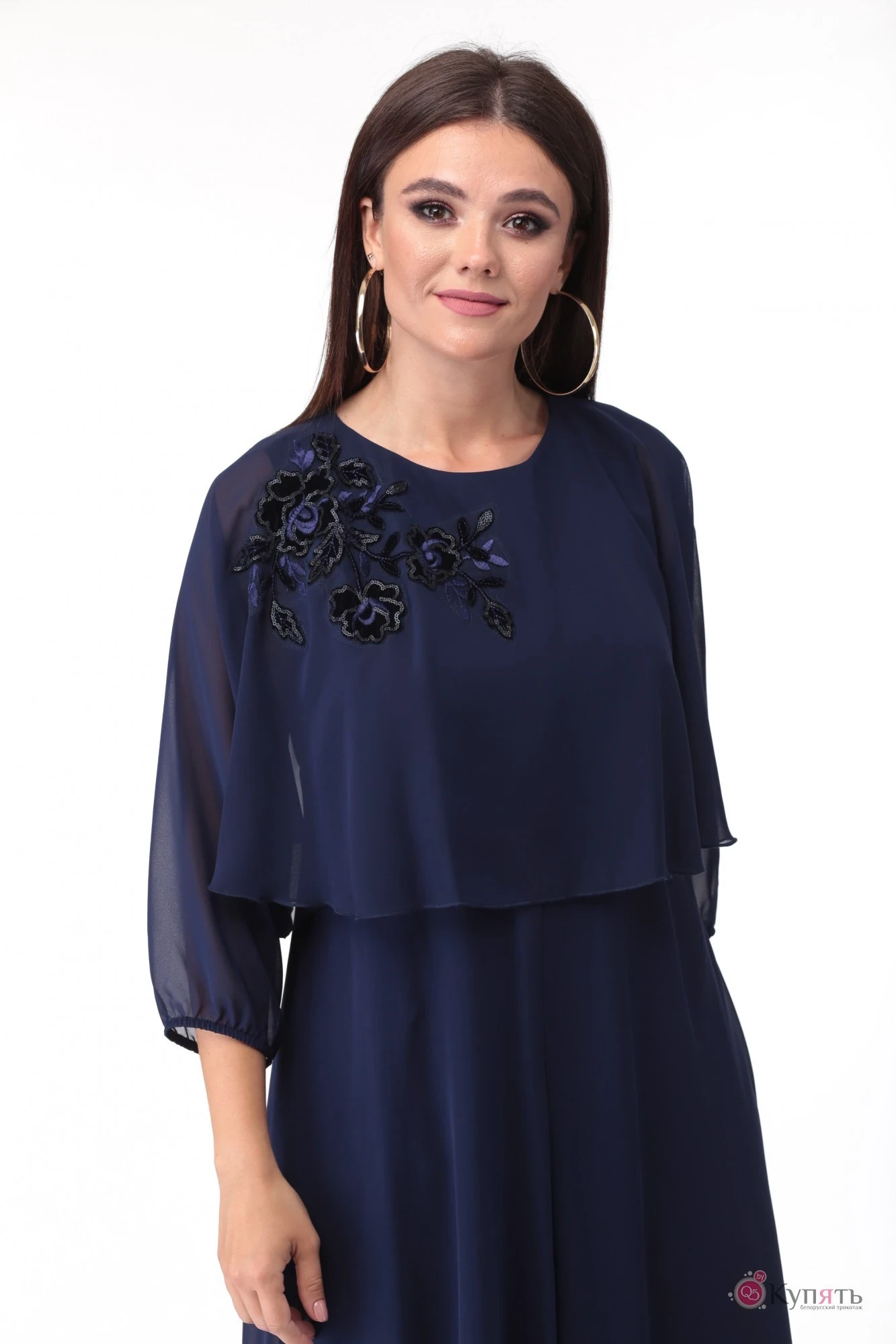 Платье выполнено из трикотажного однотонного полотна и однотонного шифона. В качестве декора использована аппликация - вышивка на сетке из бархата и паеток. Платье двухслойное, длиной макси. Основа платья выполнена из трикотажного полотна. Лиф по полочке с нагрудными вытачками, спинка с талиевыми. Нижняя часть - юбка, по передней части с талиевыми вытачками, по задней части с талиевыми вытачками и средним швом в нижней части которого обработан разрез. Верхняя часть лифа выполнена из шифона в виде пелерины с цельнокроеным рукавом. Рукав длиной 3/4, низ рукава на резинке. Горловина формы "лодочка". На правой стороне полочки пелерины выполнена аппликация из вышивки на сетке. Нижняя часть платья - юбка двухслойная, верхний слой из шифона, юбка из шифона длинная, задняя часть цельная, передняя с разрезом по центру. Платье со съемным поясом из шифона, на поясе настрочена аппликация из вышивки на сетке.