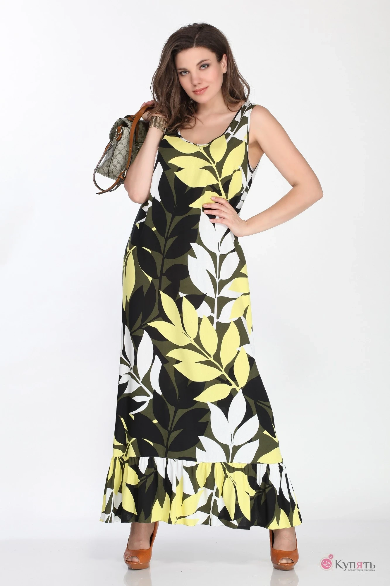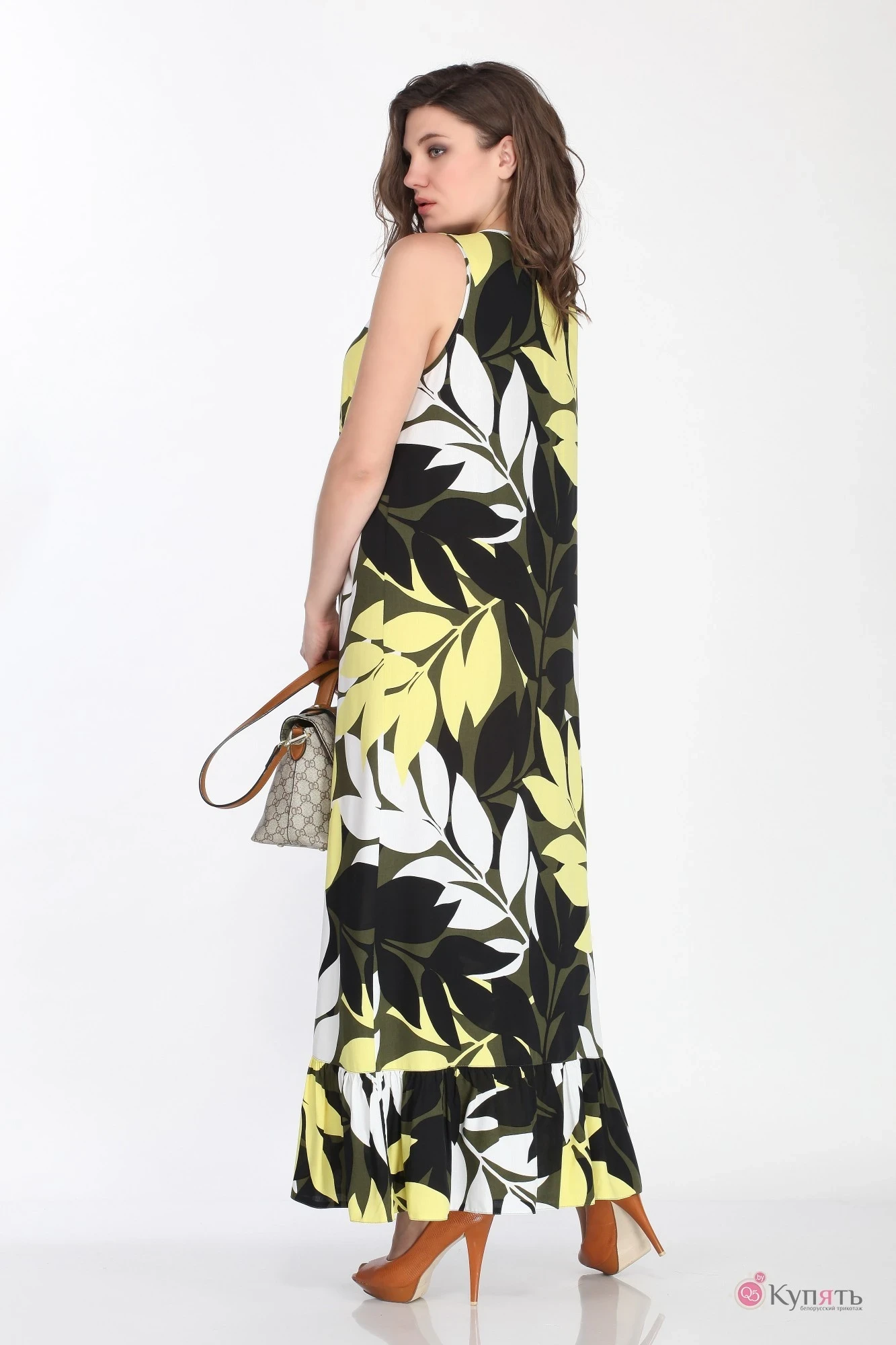 Легкое летнее платье А-образного силуэта без рукава, выполнено из текстильной ткани, вырез горловины округлой формы. По низу валан со сборкой. Длина по спинке 140 см.