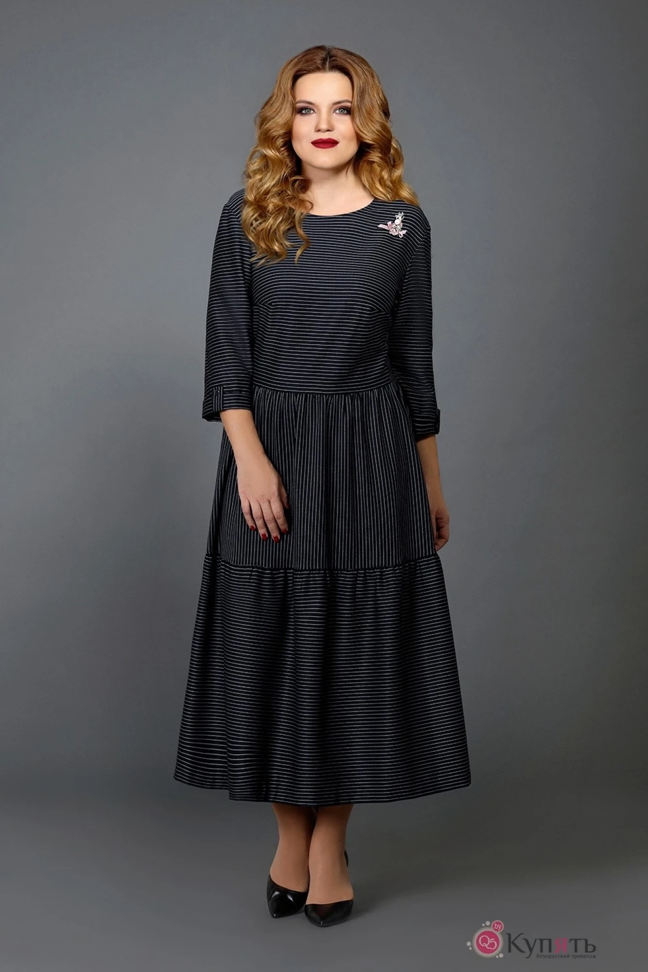 Стильное платье без подкладки. Застежка на потайную тесьму-молнию в среднем шве спинки. В комплекте украшение-брошь.