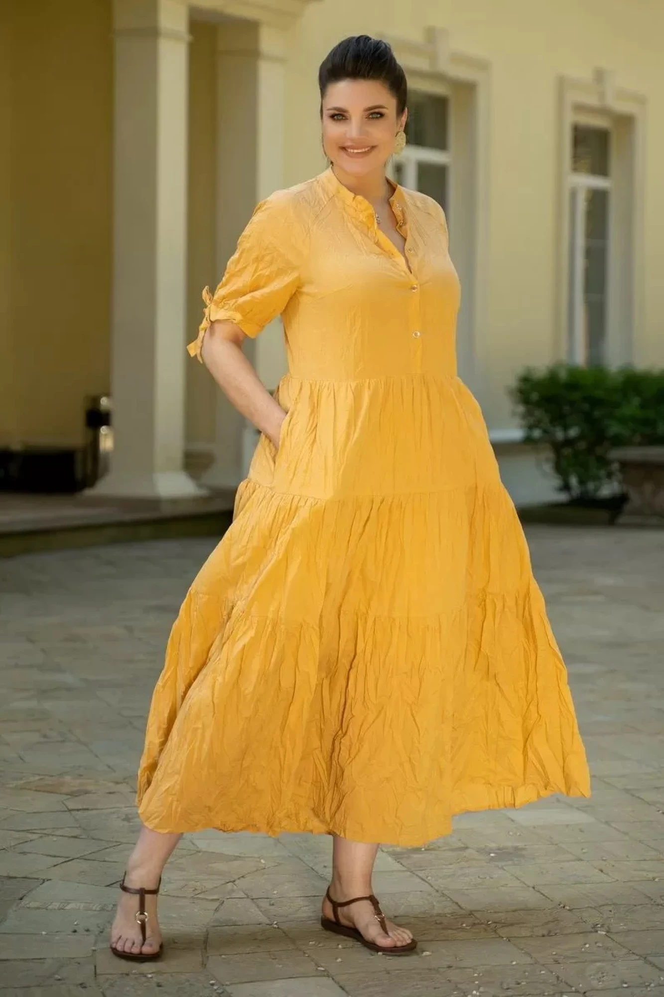 Платье силуэта трапеция, лиф застёгивается на петли пуговицы. С притачными воланами, с боковыми карманами. Рукава короткие на манжете завязке с бантиком.