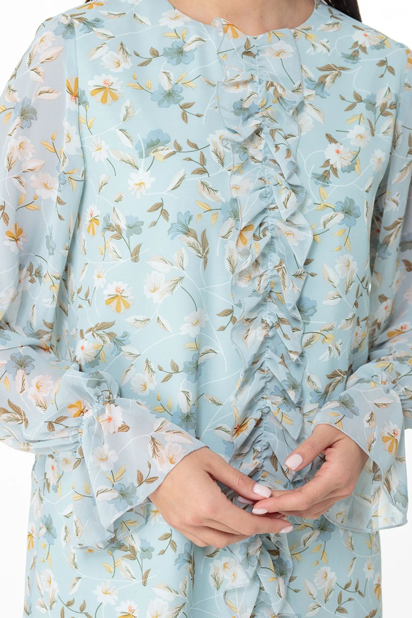 На передней части по среднему шву выполнен рюш-жабо, визуальное вытягивающий фигуру.