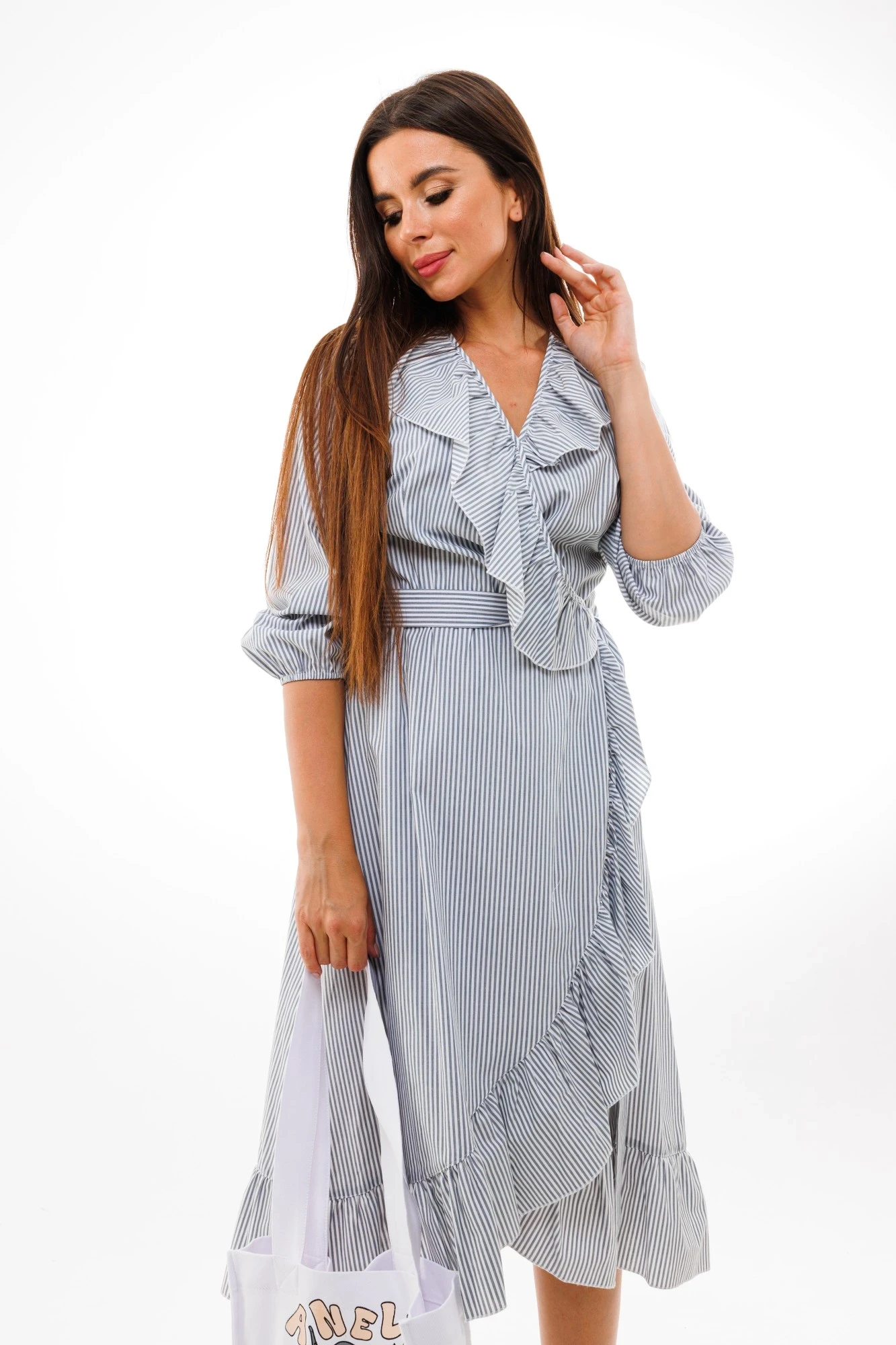 Оно украшено изысканными рюшами и имеет ассиметричный крой, придающий ему особую изящность.