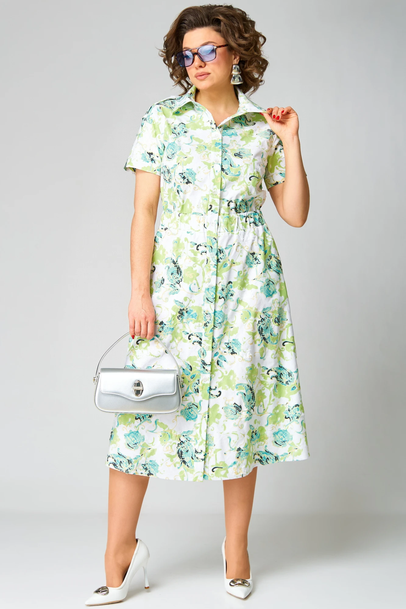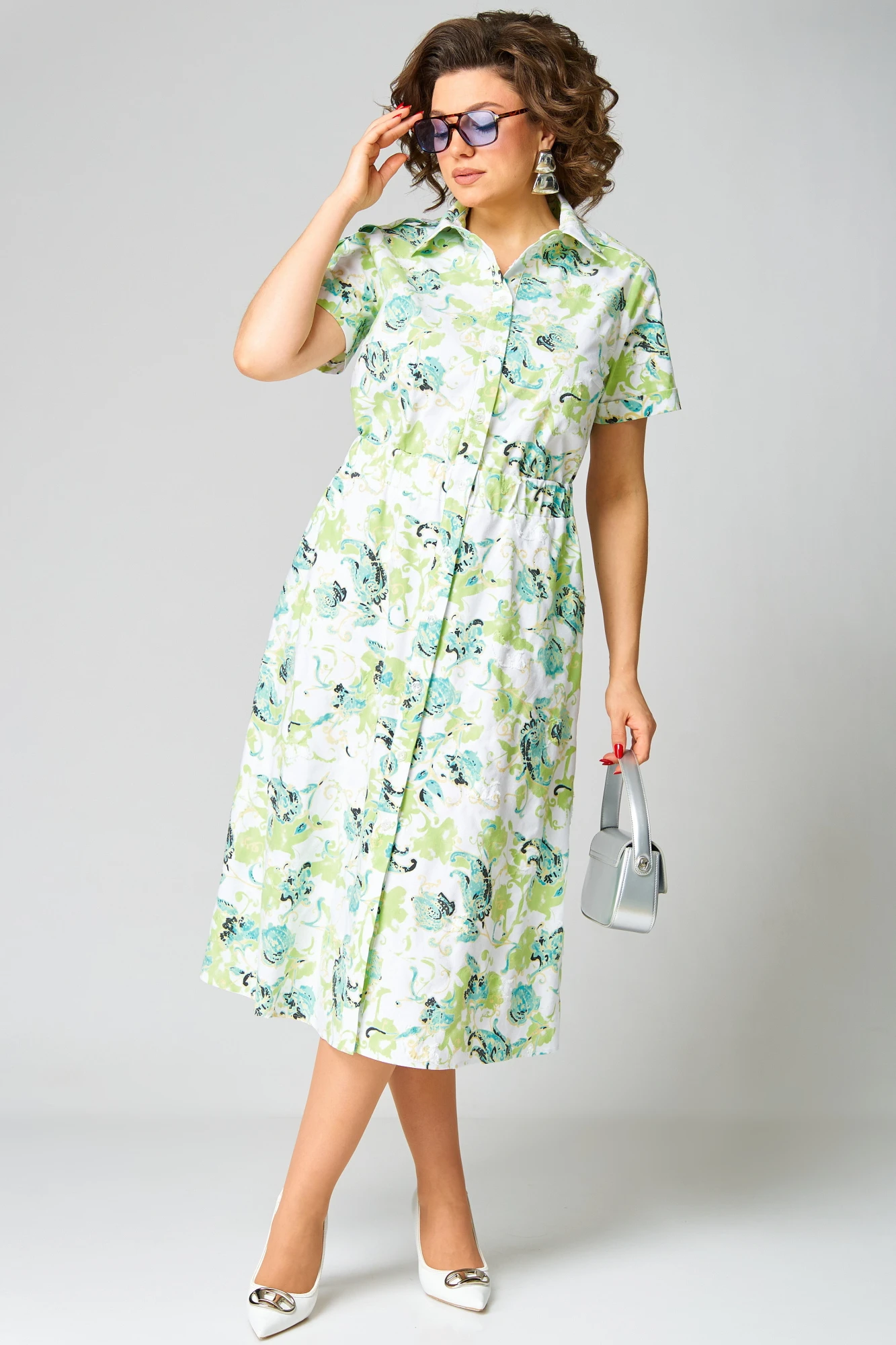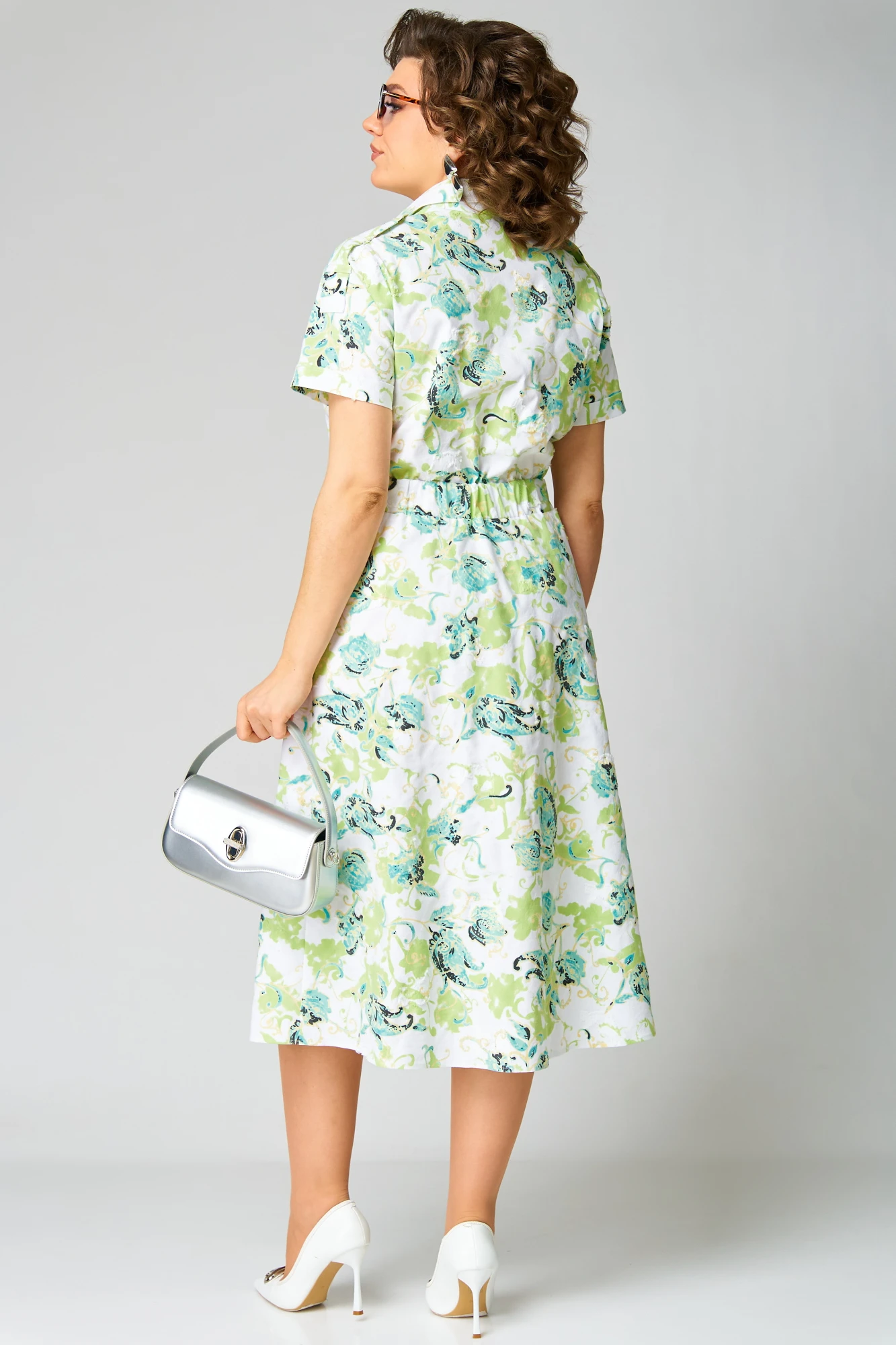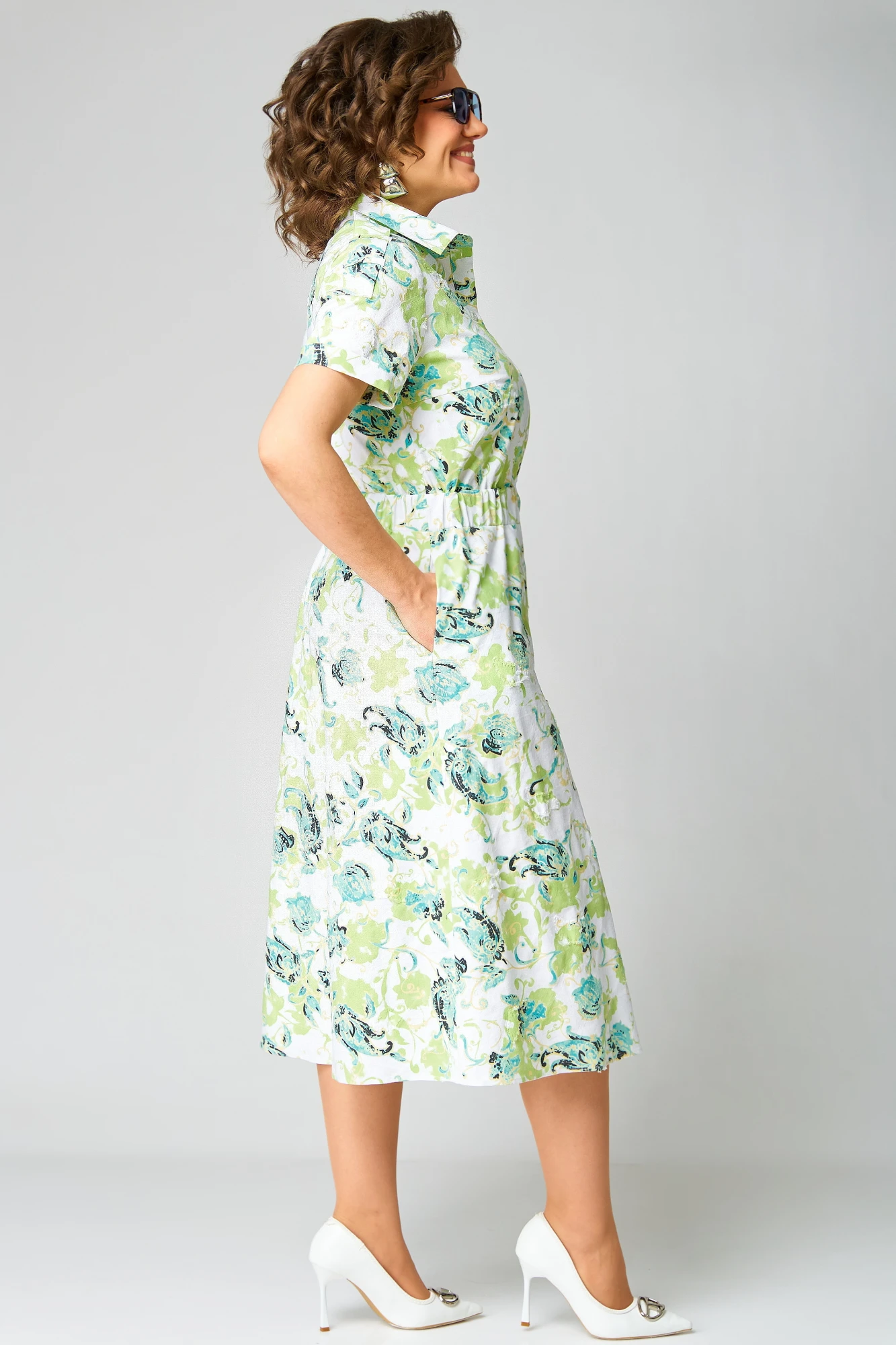 Платье полуприлегающего силуэта, расклешенное книзу. Воротник отложной, на притачной стойке. Платье отрезное по линии талии, на широкой резинке. Платье с центральной застежкой на петли и пуговицы на притачных планках. Полочка с нагрудными вытачками. В боковых швах юбки функциональные карманы. Рукав втачной короткий с широкой декоративной патой, понизу — притачная манжета."