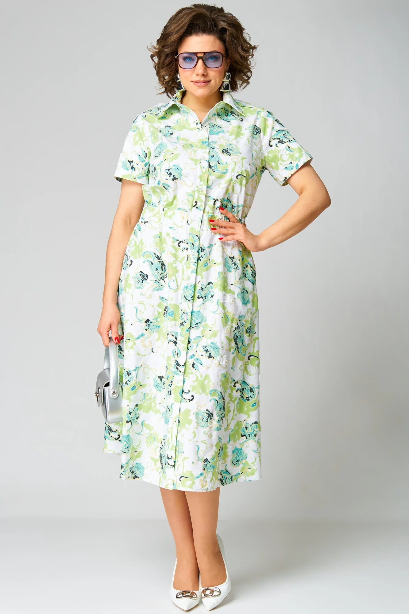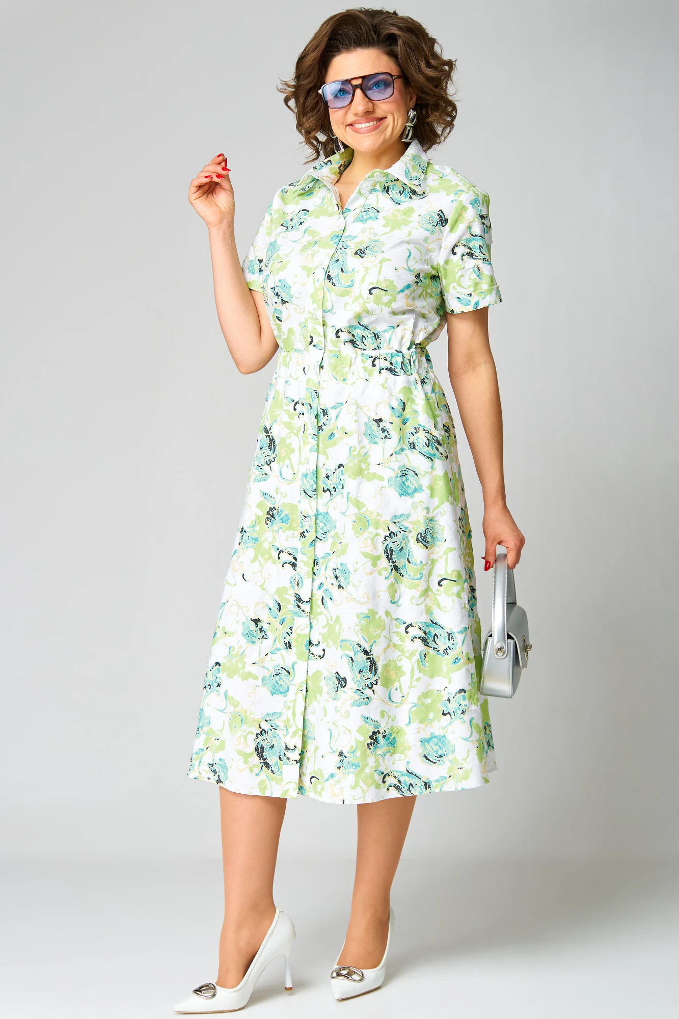 Платье полуприлегающего силуэта, расклешенное книзу. Воротник отложной, на притачной стойке. Платье отрезное по линии талии, на широкой резинке. Платье с центральной застежкой на петли и пуговицы на притачных планках. Полочка с нагрудными вытачками. В боковых швах юбки функциональные карманы. Рукав втачной короткий с широкой декоративной патой, понизу — притачная манжета."