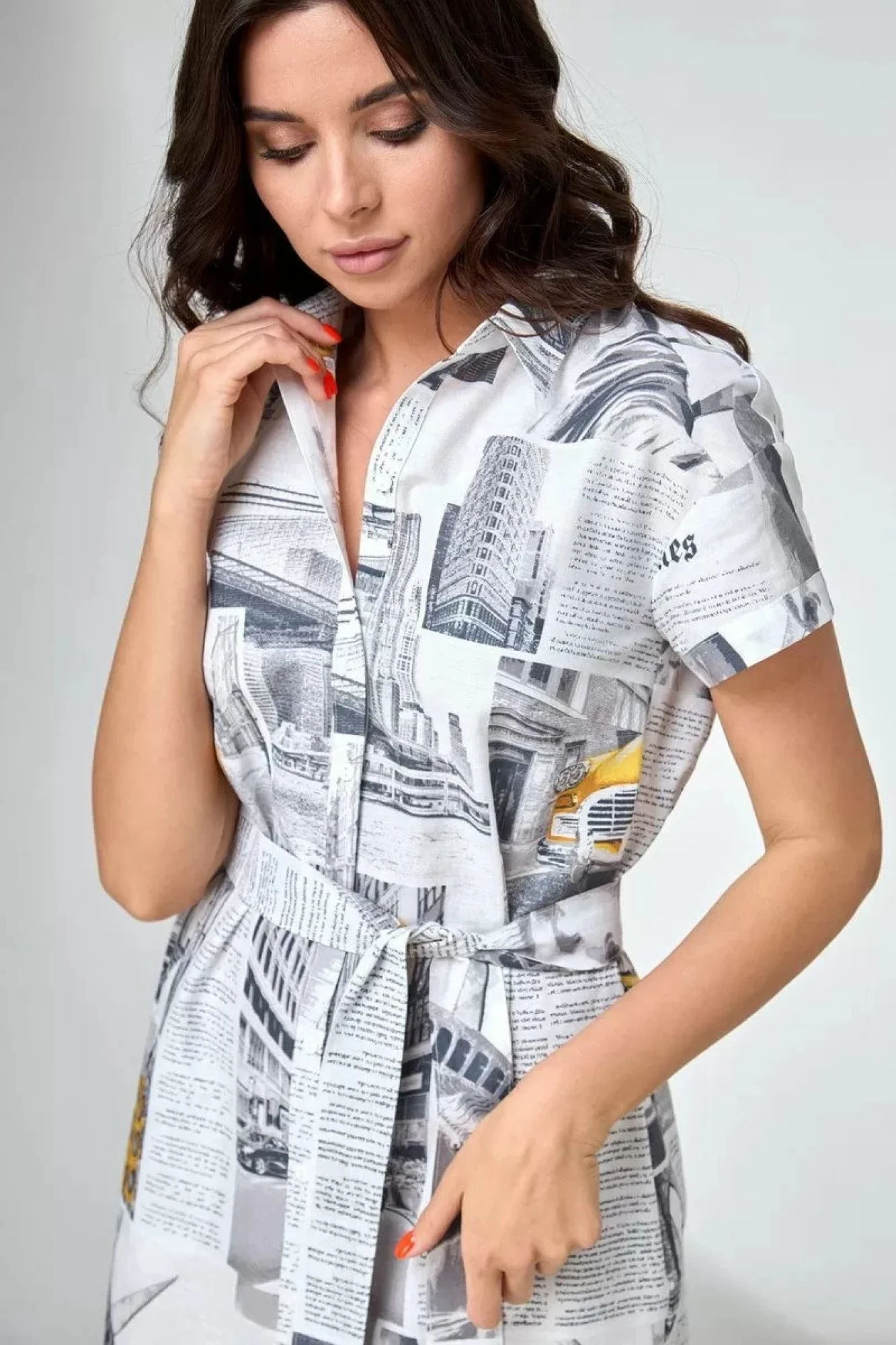 Платье прямого силуэта. Воротник рубашечного типа на притачной стойке. Перед платья с центральной застежкой на притачных планках и нагрудными вытачками. Спинка с кокеткой и двумя встречными складками в нижней части. В боковых швах разрезы полукруглой формы. Рукав втачной короткий, со спущенным плечевым срезом, понизу с притачной манжетой. В комплект входит съемный пояс пояс из основной ткани."
