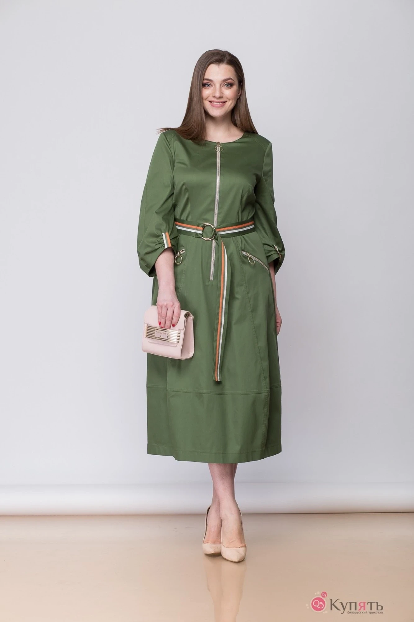 Платье миди отрезное по талии из хлопчатобумажной ткани с рукавами, длиной ниже локтя, карманами на уровне бедер на молнии, приталенным лифом с застежкой молнией и поясом, отделанным декоративной тесьмой. Юбка платья силуэта "кокон". Швы отделаны двойной строчкой. Силуэт платья поддержан формой рукава.