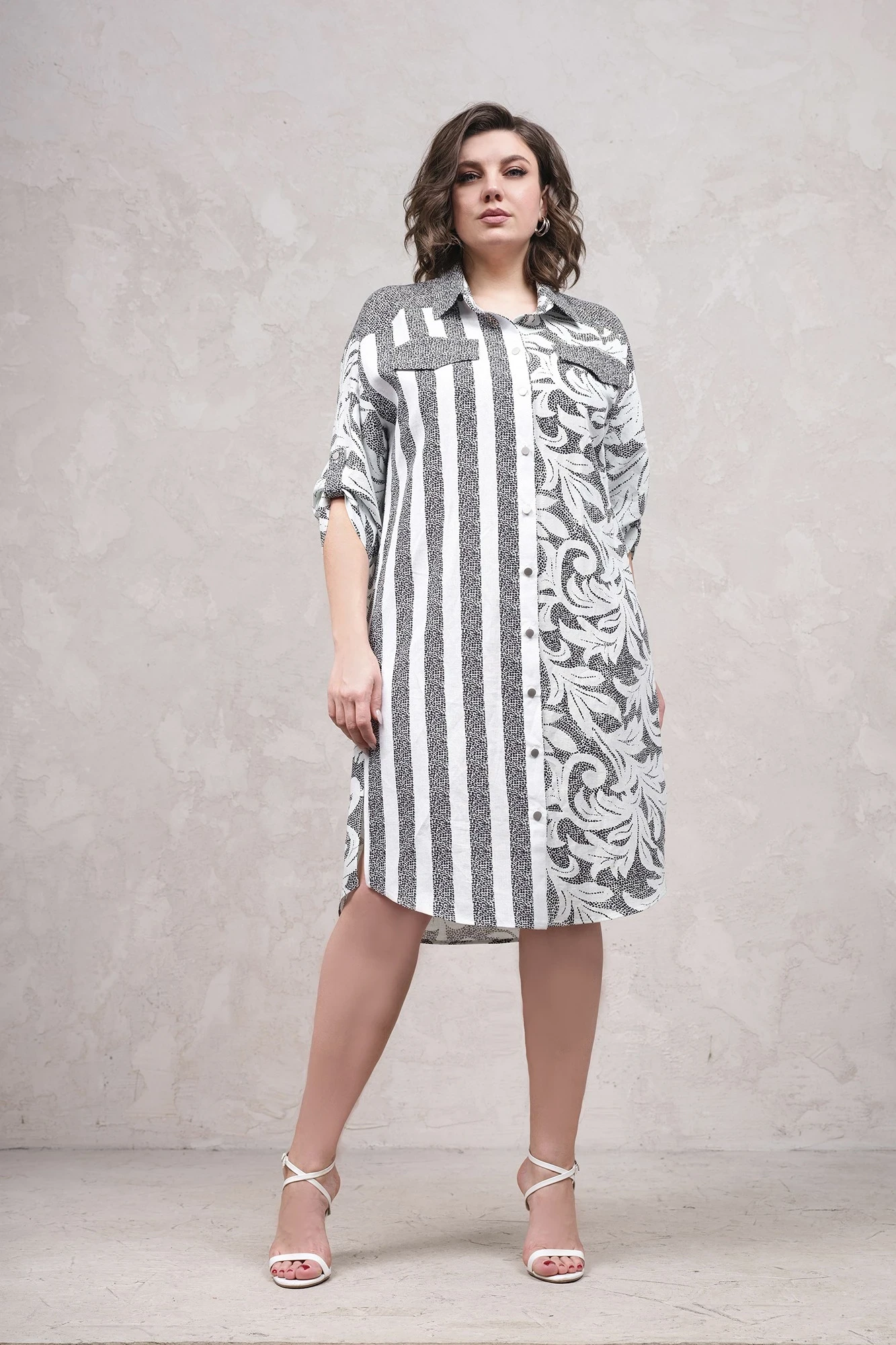 Летнее платье-рубашка свободного прямого силуэта с застежкой на пуговицах. Длина миди с разрезами по бокам, по спинке - кокетка со встречной складкой, спереди - декоративные клапаны.