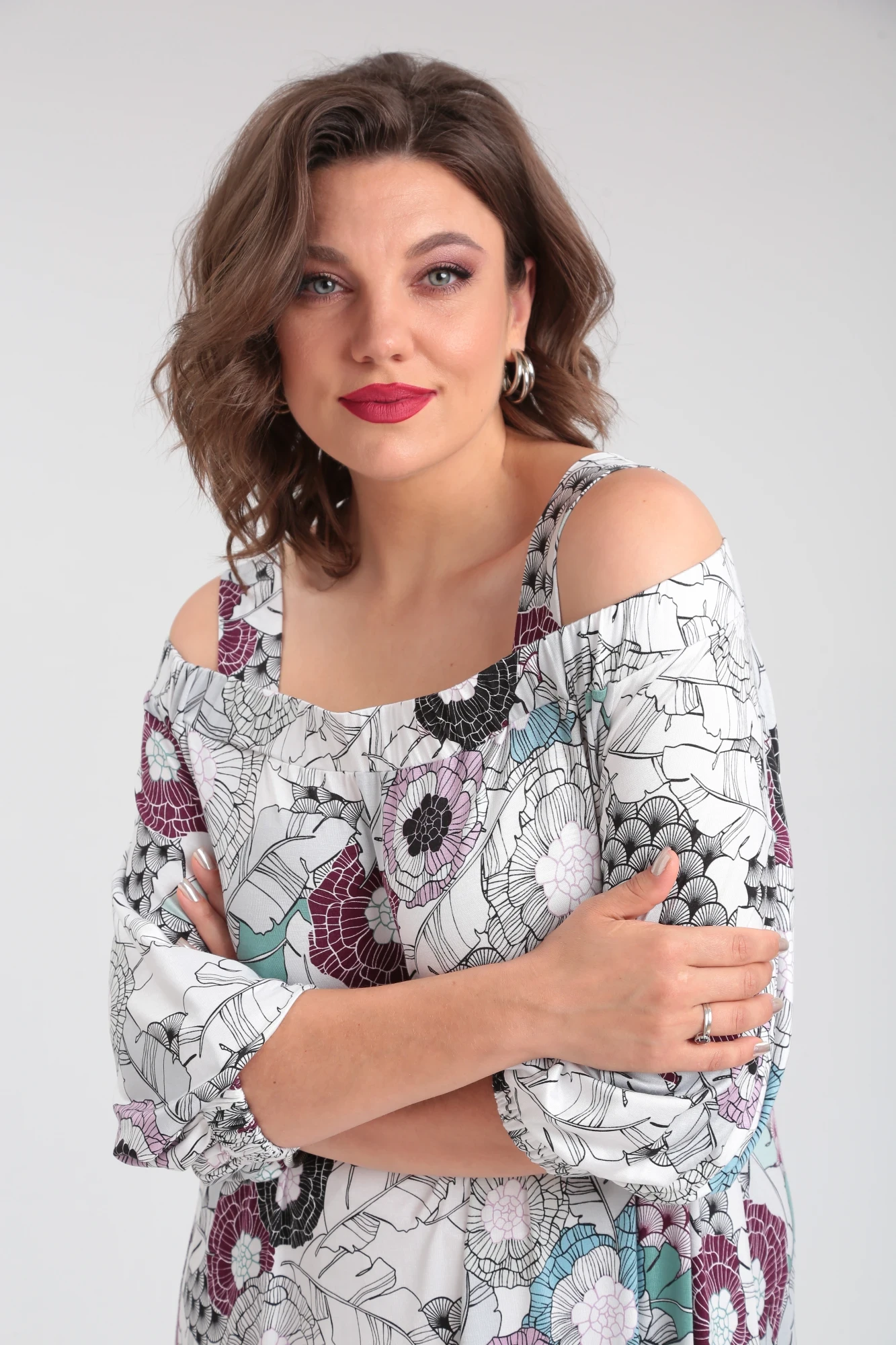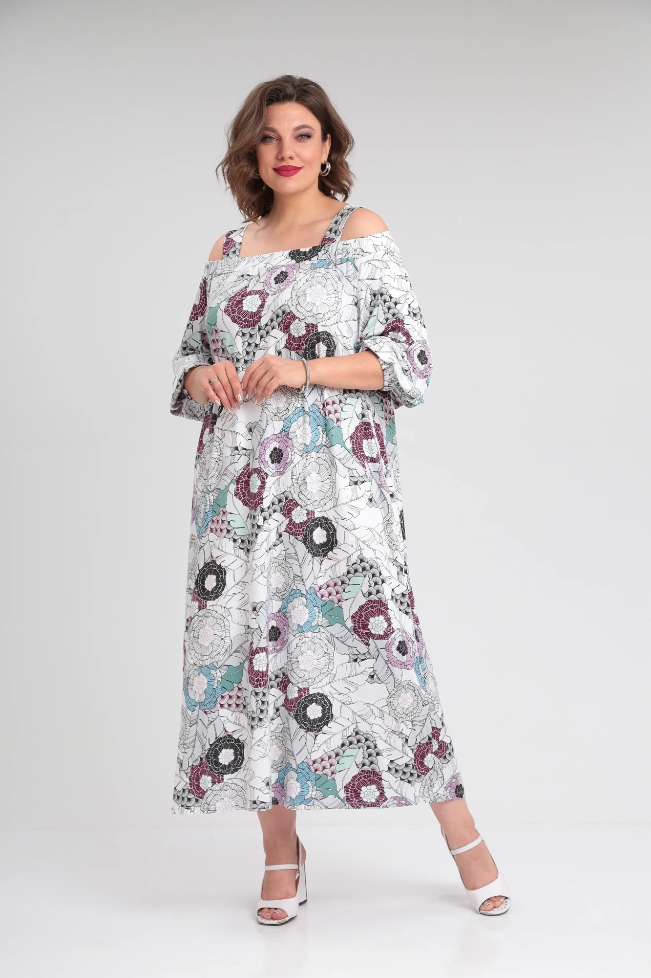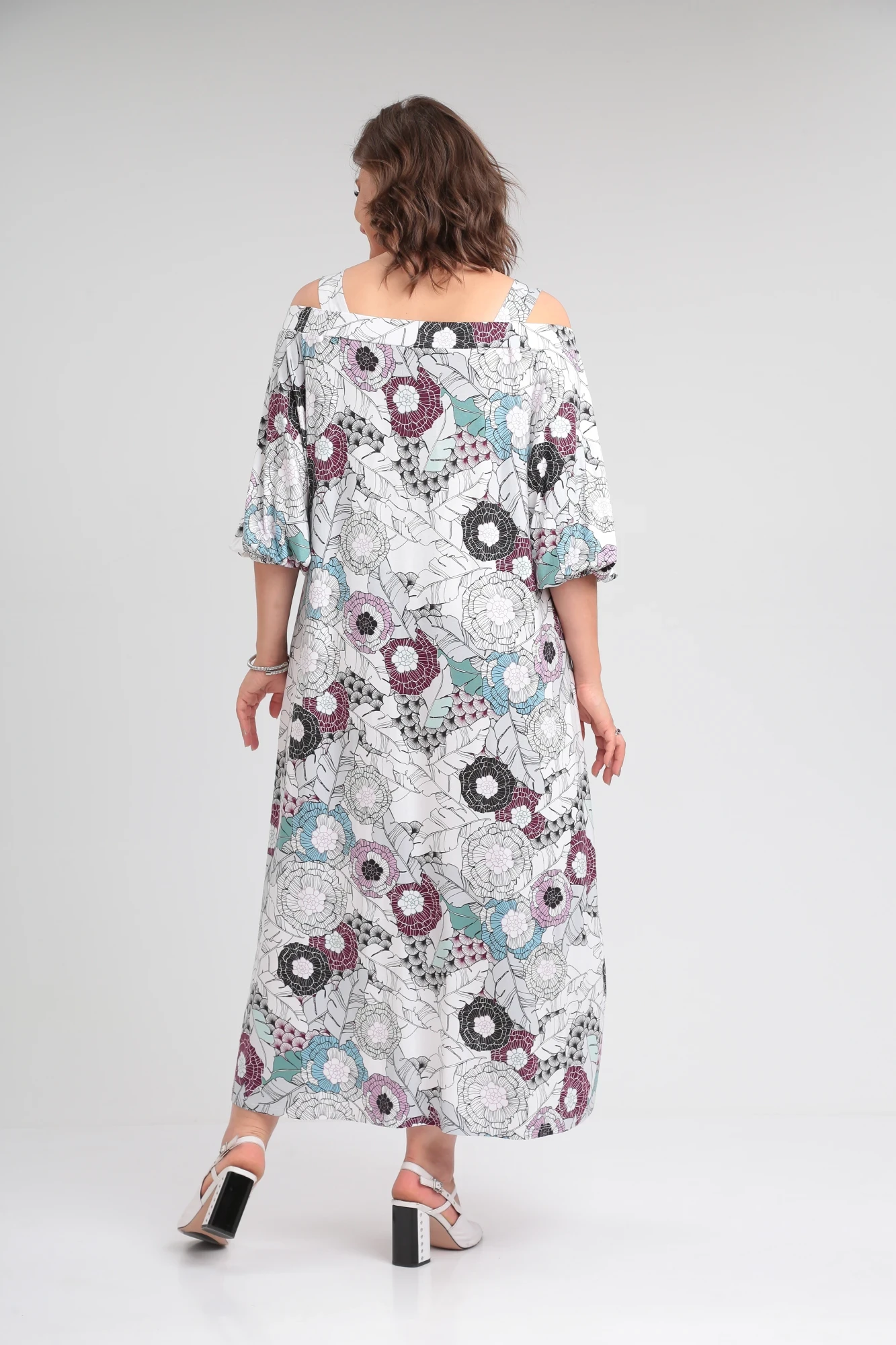 Платье А-силуэта, удлиненное. Верхняя часть платья спущена на плечи, фиксируется широкой резинкой, на плечах есть широкие бретели, закрывающие бретели бюстгалтера. Рукав 3/4 на резинке. Длина по спинке-122см, длина по боку от проймы-109см, длина рукава-49см
