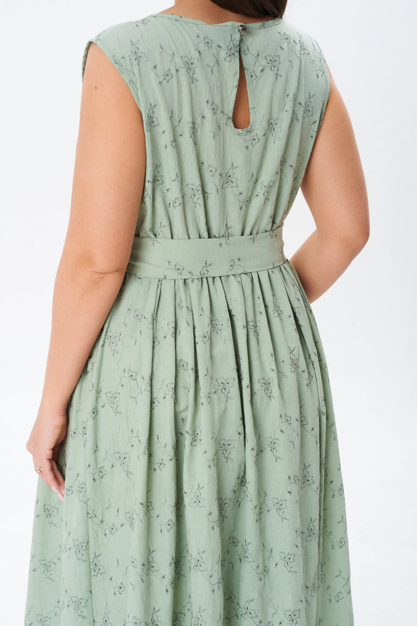 Верхняя часть изделия выполнена без рукавов, с нагрудными вытачками. Завышенная талия выгодно подчёркивает силуэт, и удлиняет фигуру. Горловина округлой формы, обтачная. По спинке платья выполнен фигурный подрез в виде капельки, который застегивается на навесную петлю-пуговицу. В области талии платье слегка присобрано на резинку. Нижняя часть платья выполнена на подкладке из основной ткани. В комплект входит пояс из основной ткани, благодаря которому можно выгодно подчеркнуть достоинства Вашей фигуры!
