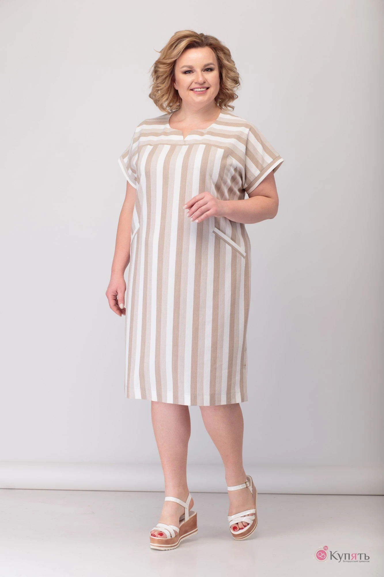 Платье женское полуприлегающего силуэта с цельнокроенным, коротким рукавом. Низ рукава с притачной манжетой. Спинка приталена средним швом, имеется кокетка. Полочка с кокеткой. Горловина фигурной формы. По боковым швам имеются шлицы с отделолчными пуговицами.