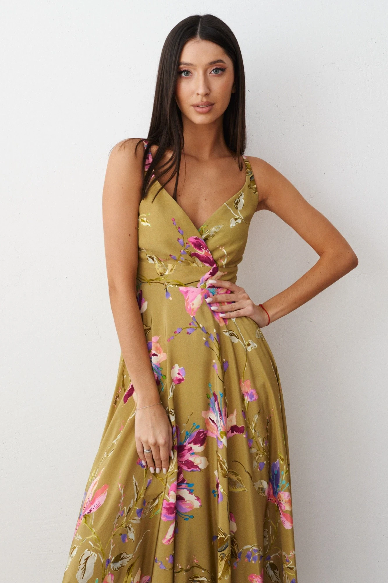Платье полуприлегающего силуэта выполнено из струящегося полотна с цветочным принтом. Характеристики: полуприлегающий силуэт, отрезное, по отрезу стабильная вставка, регулируемые бретели, фигурный вырез горловины, застежка - потайная молния по спинке, юбка в изделии пышная, свободного кроя. Длина по спинке 128 см.