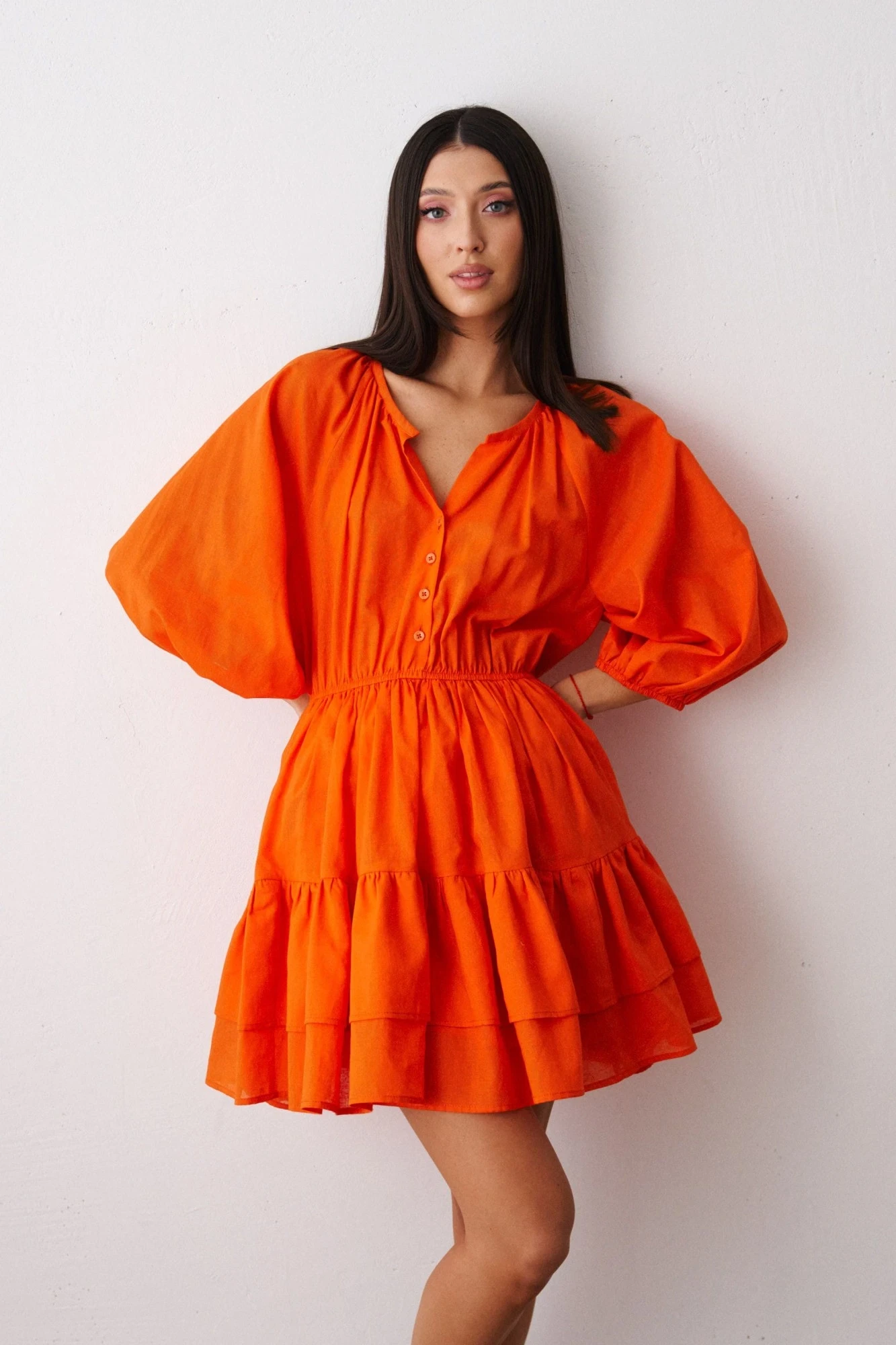Платье полуприлегающего силуэта выполнено из натуральной ткани цвета мандарин. Характеристики: полуприлегающий силуэт, отрезное, отрез на резинке, горловина овальная, застежка центральная на петли пуговички, рукав - покрой реглан, по низу рукава резинка, юбка в изделии на подкладке по низу волан. Длина изделия по спинке 86, длина от края горловины 58 см.