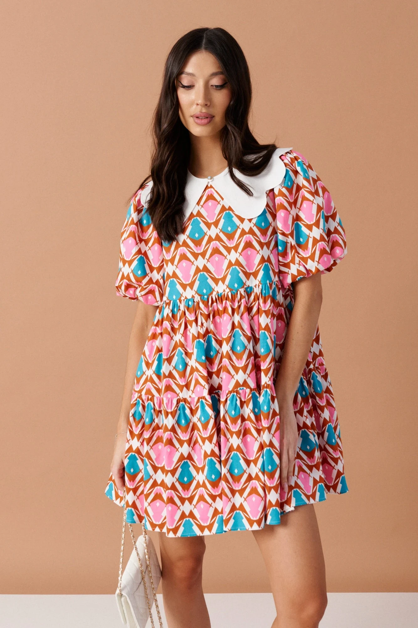 Платье свободного кроя с акцентным воротником выполнено из ткани с абстрактным принтом. Характеристики: прямой свободный крой, отрезное, горловина овальная, рукав объёмный, по низу рукава подгиб на резинке, застежка потайная тесьма молния в среднем шве заднего полотна изделия, в комплекте крупный съёмный воротник. Длина по спинке 83 см, длина рукава 32 см.