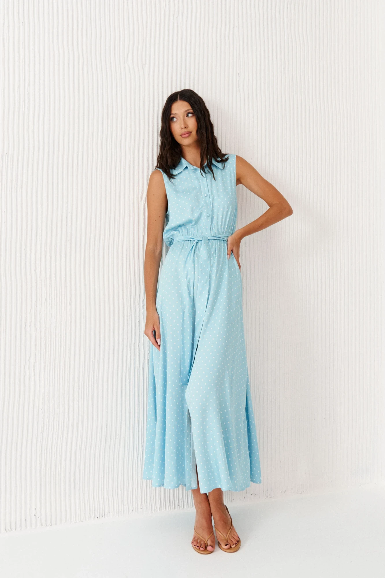Платье прямого кроя выполнено из голубого полотна с принтом белый горох. Характеристики: прямой крой, отрезное, по отрезу резинка, отложной воротник, застежка центральная на петли пуговицы, по линии талии нашиты шлевки, в комплекте пояс из ткани основного изделия. Длина по спинке 132 см.