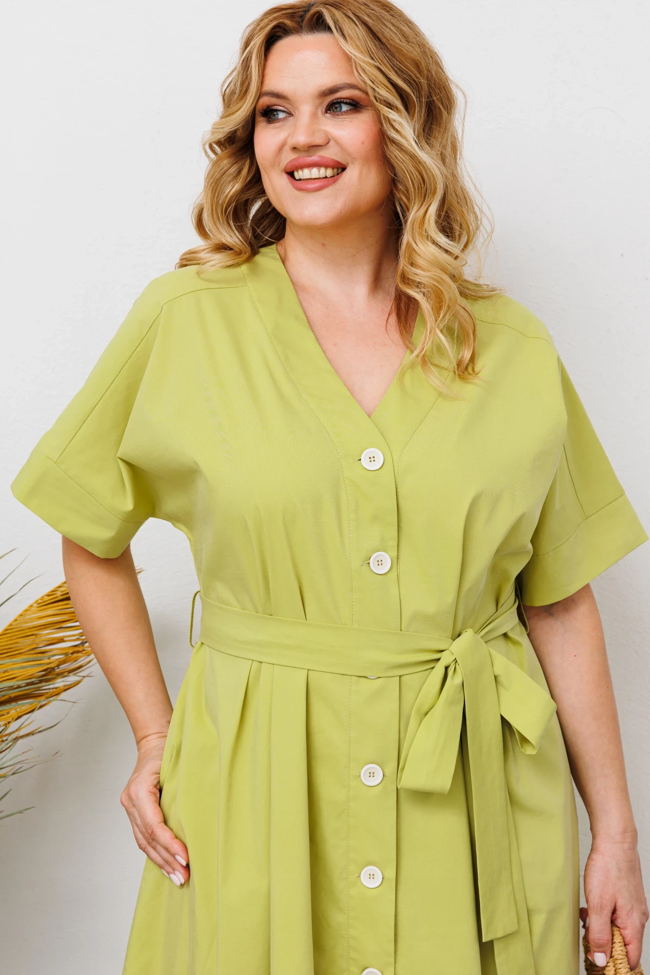 Платье - рубашка романтичного силуэта. застежка по переду на пуговицы. В комплекте идет пояс из основной ткани. Рукав короткий цельнокроенный. В боковом шве расположены карманы. По переду на юбке складки, сзади сборка. Длина - 115 см