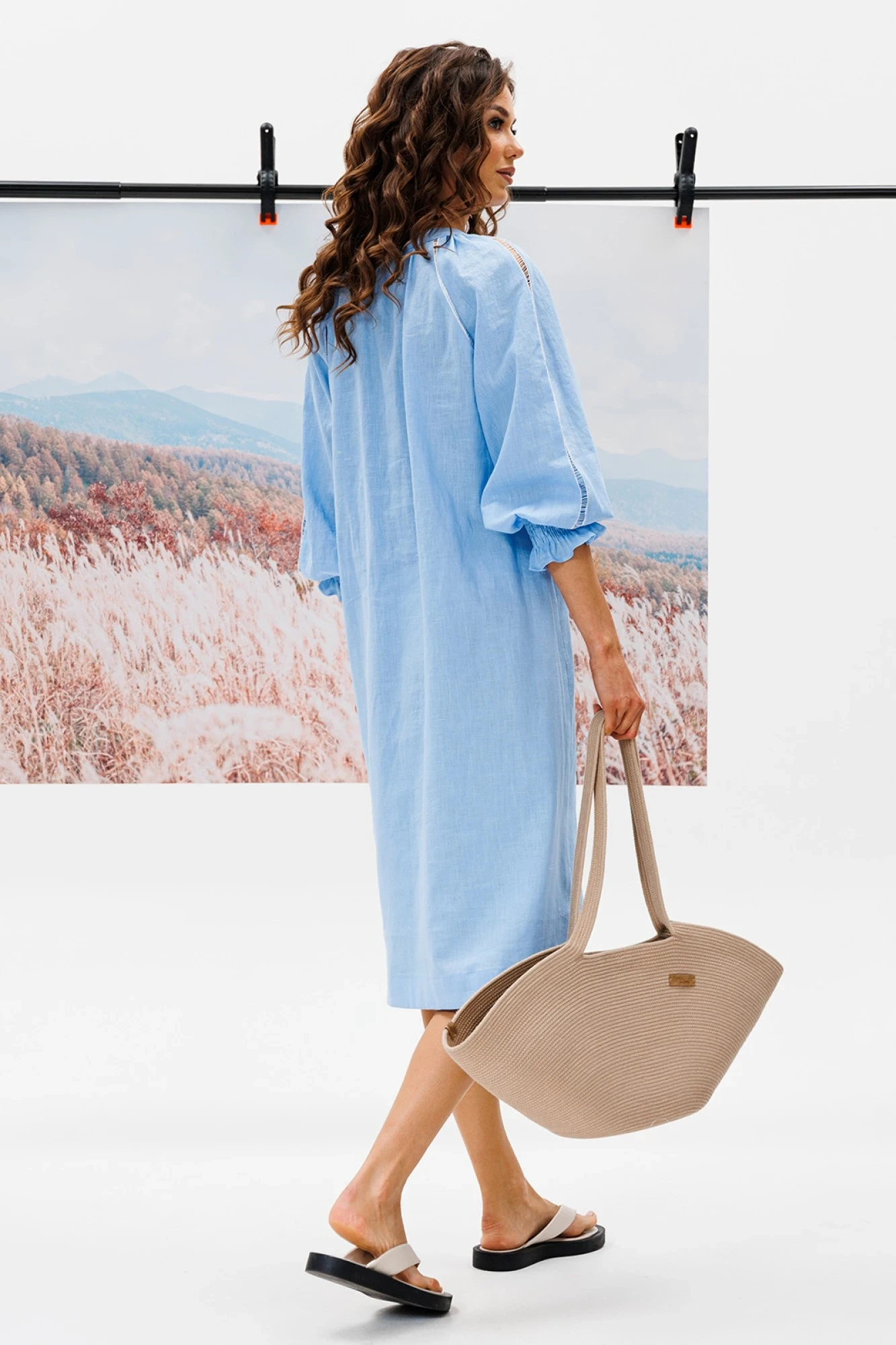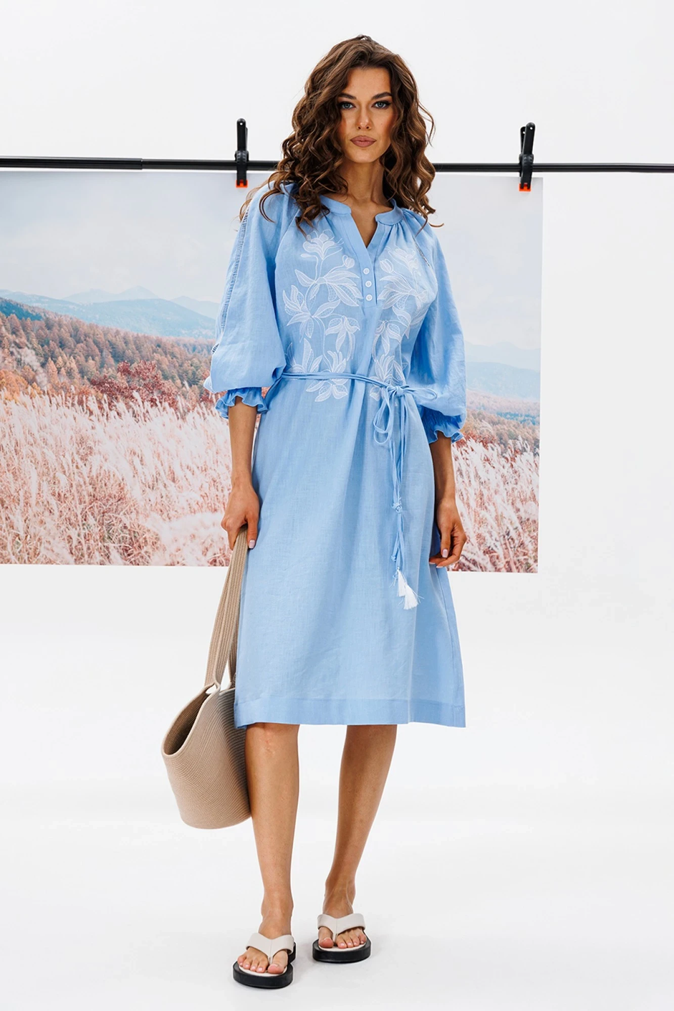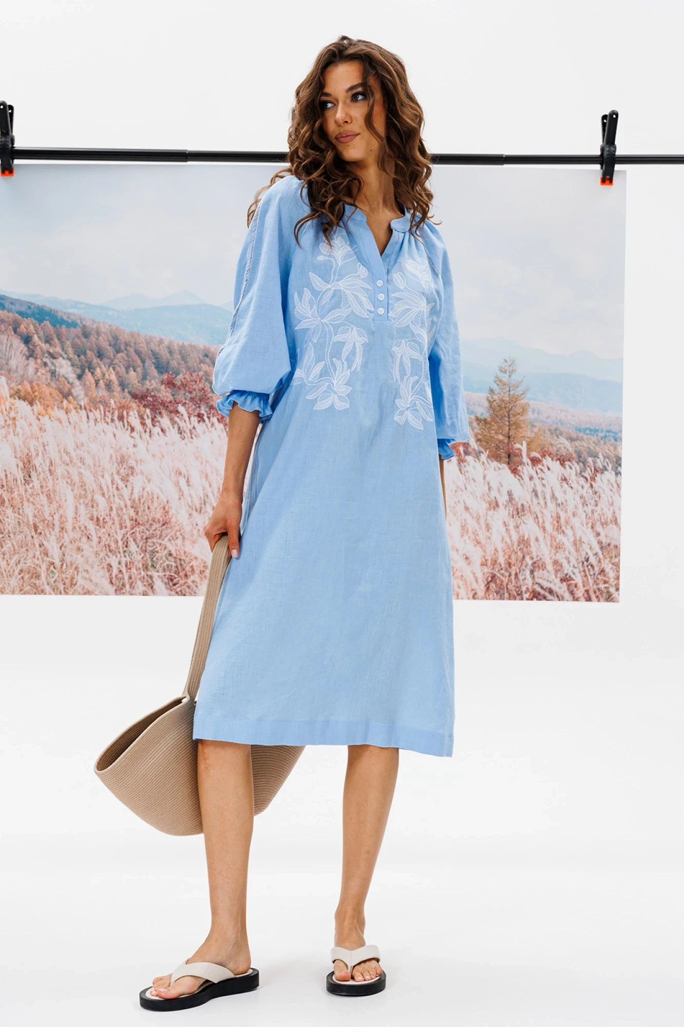 Платье прямого силуэта длинной миди. Рукав реглан 7/8 со сборкой вверху и внизу с притачной манжетой на резинках. По перду вышивка и V-образный вырез с застежкой на петли-пуговицы по притачной планке. По переду и спинке сборка по горловине. По рукаву вставлено кружево. Воротник-стойка. Пояс из основной ткани в комплекте.
