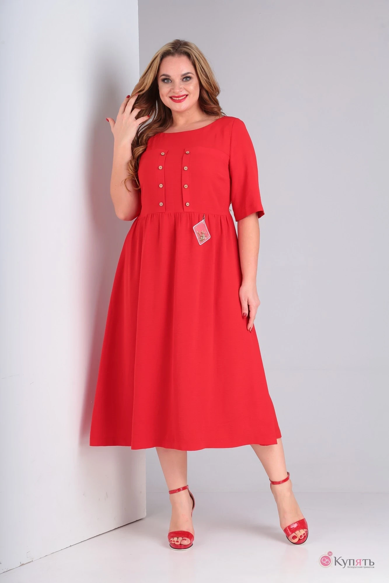 Нежное легкое платье в изумительно ярком цвете. Силуэт свободный, отрезное чуть выше линии талии;рукав втачной , длиной 33 см. Горловина округлая, обработана бейкой с отделочной строчкой. Верхняя часть переда с нагрудными вытачками и декоративными подкройными элементами с пуговичками. Верхняя часть спинки с центральной застежкой на петли-пуговицы. Нижняя часть платья присобрана по линии притачивания к лифу и мягко расширено к низу, красиво облегая фигуру. По переду изделия с левой стороны расположено съёмное декоративное украшение в виде шеврона . В этом ярком платье вы, несомненно, будете в центре внимания, а хорошее настроение - залог успеха.