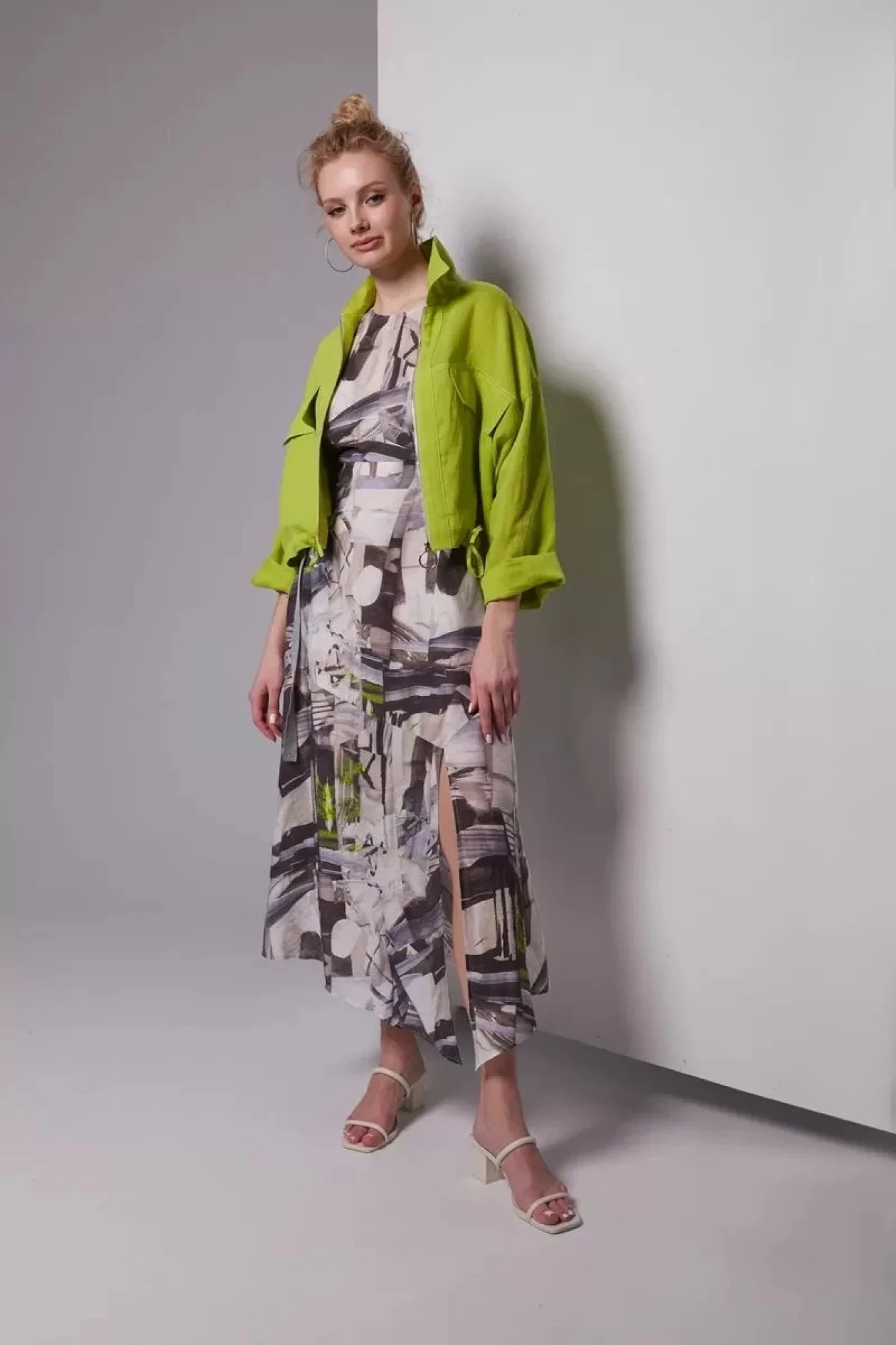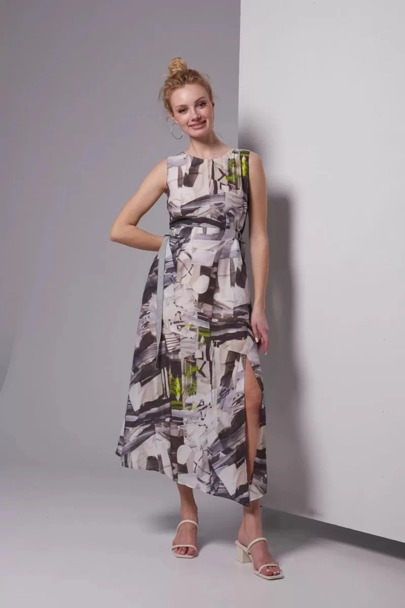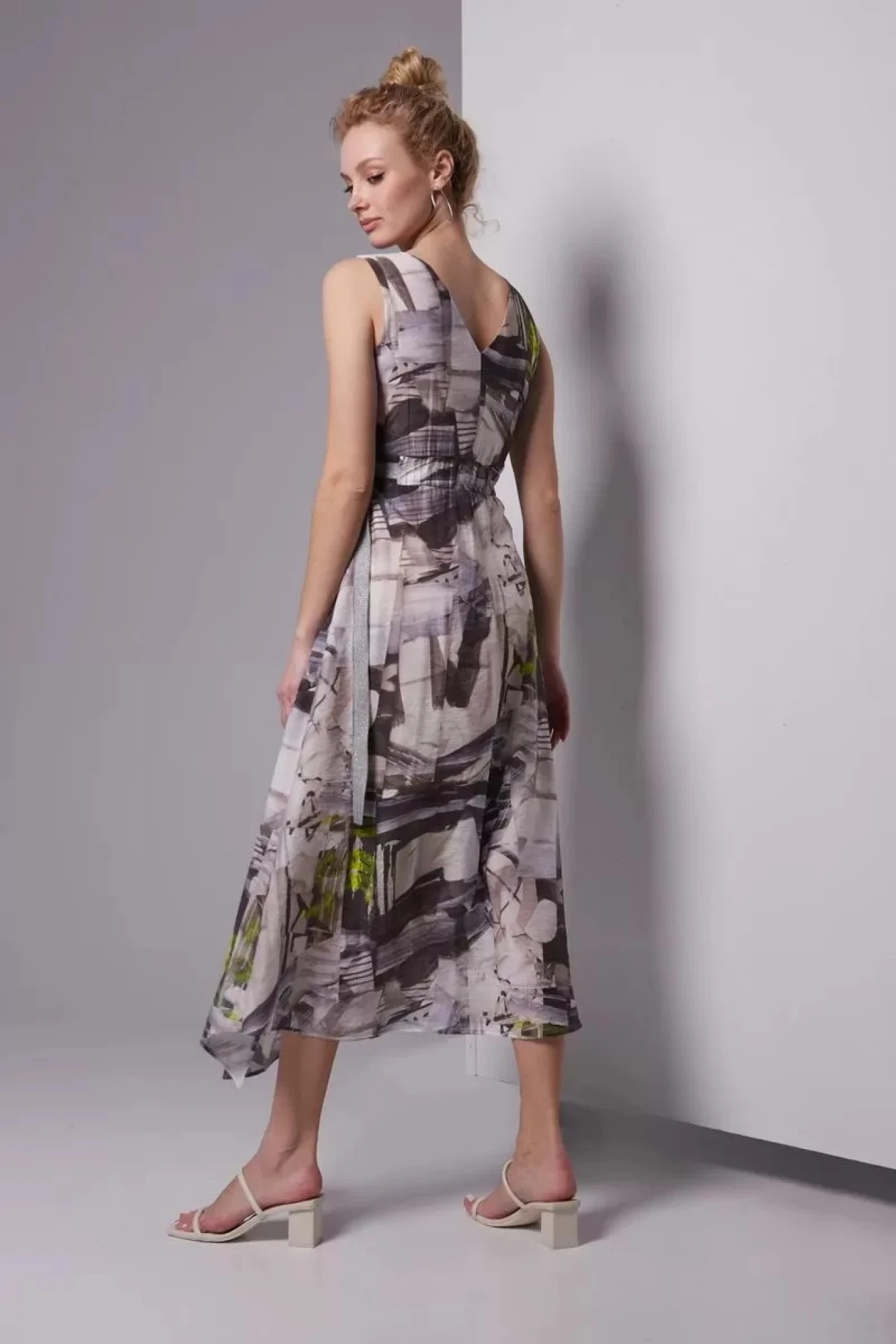 Платье из тонкой ткани платьево-блузочного ассортимента. Платье отрезное по талии, лиф полуприлегающего силуэта, нижняя часть платья расширена, с диагональными подрезами и разрезом слева. Платье длиной до середины икры, линия низа ассиметричная, с выраженным углом в нижней точке разреза. Горловина переда округлой формы, спинки – V-образной. Лиф переда с нагрудными вытачками из боковых швов, спинка со средним швом. На талии два горизонтальных подреза, виде пояса, на участке спинки эластичная тесьма и две завязки из декоративной тесьмы, переходящие на полочку и протянуты через полукольца. Застёжка на потайную тесьму молнию в левом боковом шве. Платье без рукавов, на подкладке из тонкой вискозы.