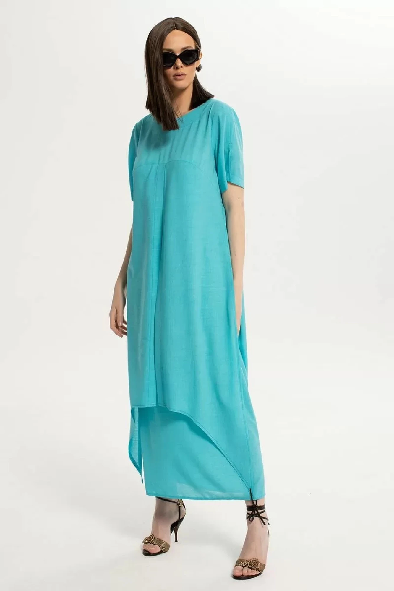 Летнее платье отрезное по линии груди. Нижняя часть платья выполнена с декоративными отлетными деталями по переду и по спинке. Рукав короткий с декоративными разрезами.