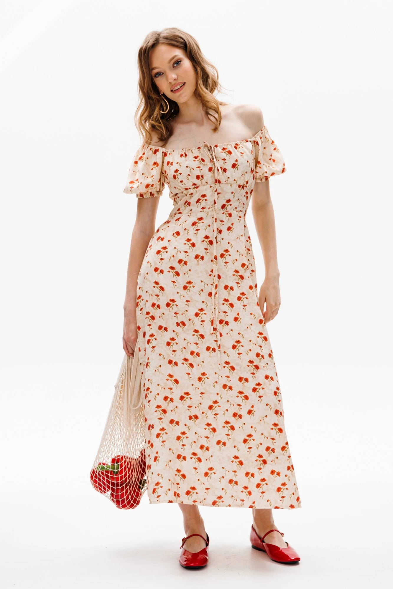 Платье выполнено из плательной ткани с цветочным принтом. Платье А-образного силуэта, длиной миди. Горловина спереди и на спинке горизонтальной формы. Нижняя часть переда выполнена в виде широкого втачного пояса. Спереди средний шов, в нем прорезь с кулисой для шнурка. Рукав покроя полуреглан со сборкой и эластичной тесьмой по окату. Низ рукава расширен, присборен и обработан эластичной тесьмой. Юбка расширена к низу. В левом боковом шве застежка на потайную молнию. Платье на отлетной по низу подкладке.