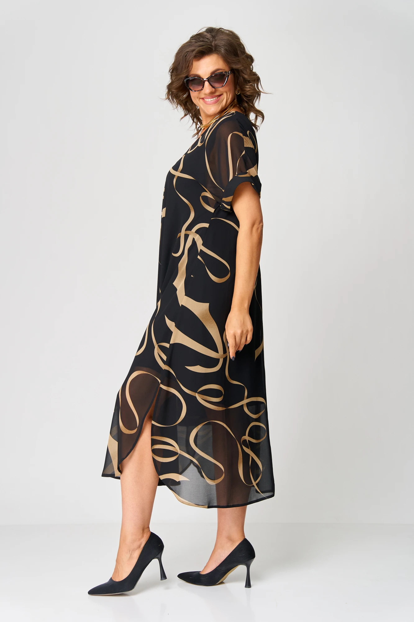 Платье женское нарядно-поседневное полуприлегающего силуэта расширенное к низу на подкладке. Выполено из шифона. Подкладка трикотажная. Вырез горловины V-образный на обтачке, рукав спущенный по низу на притачной манжете. Низ фигурный. В боковых швах обработаны разрезы. Горловина спинки с фигурным вырезом и пряжкой. декором платья служит дизайн самой ткани.